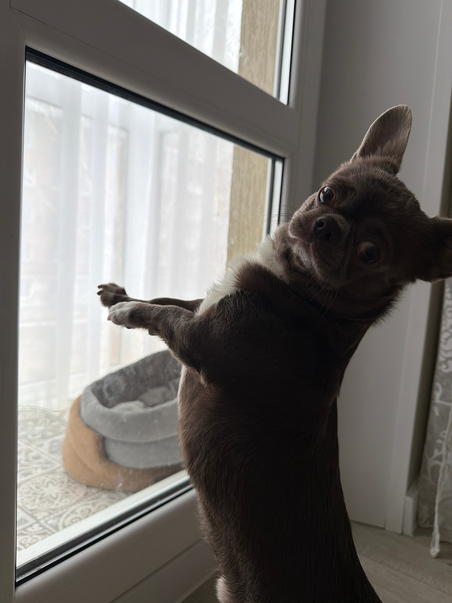 A gray Chihuahua dog is perched on a white windowsill, looking downwards. The window is in a room, with a view out to what appears to be a cold or wintery scene with light-colored or white elements vi…read more