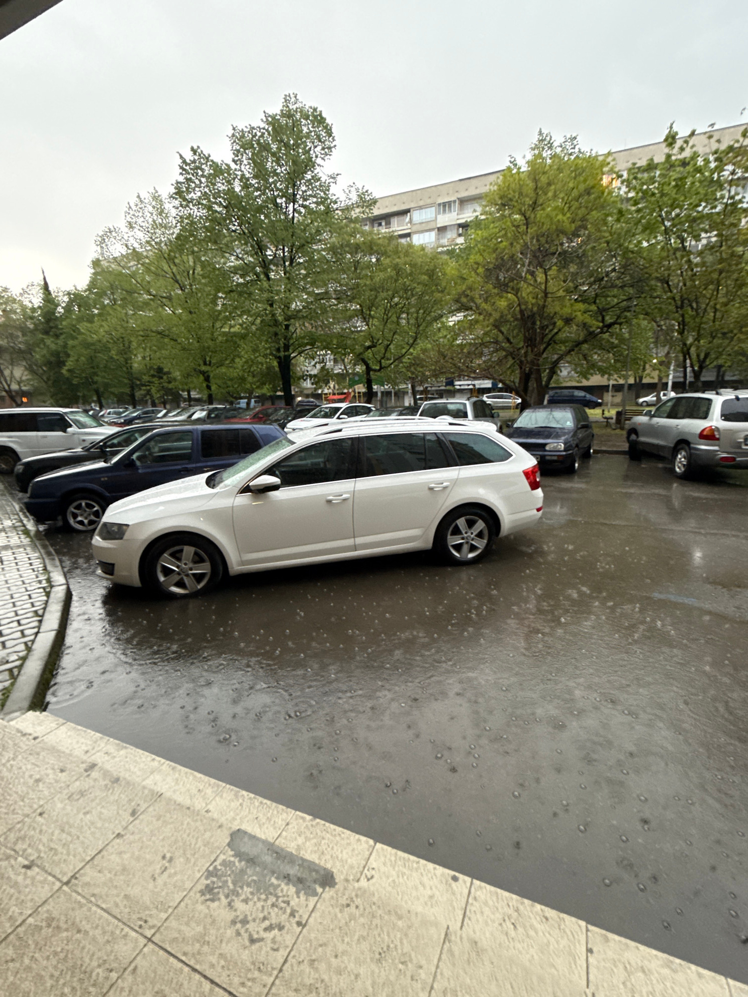 The image, taken in Stara Zagora, Bulgaria, captures an urban street scene on an overcast and rainy day. The ground where cars are parked is dark and visibly wet, with numerous small circles and rippl…read more