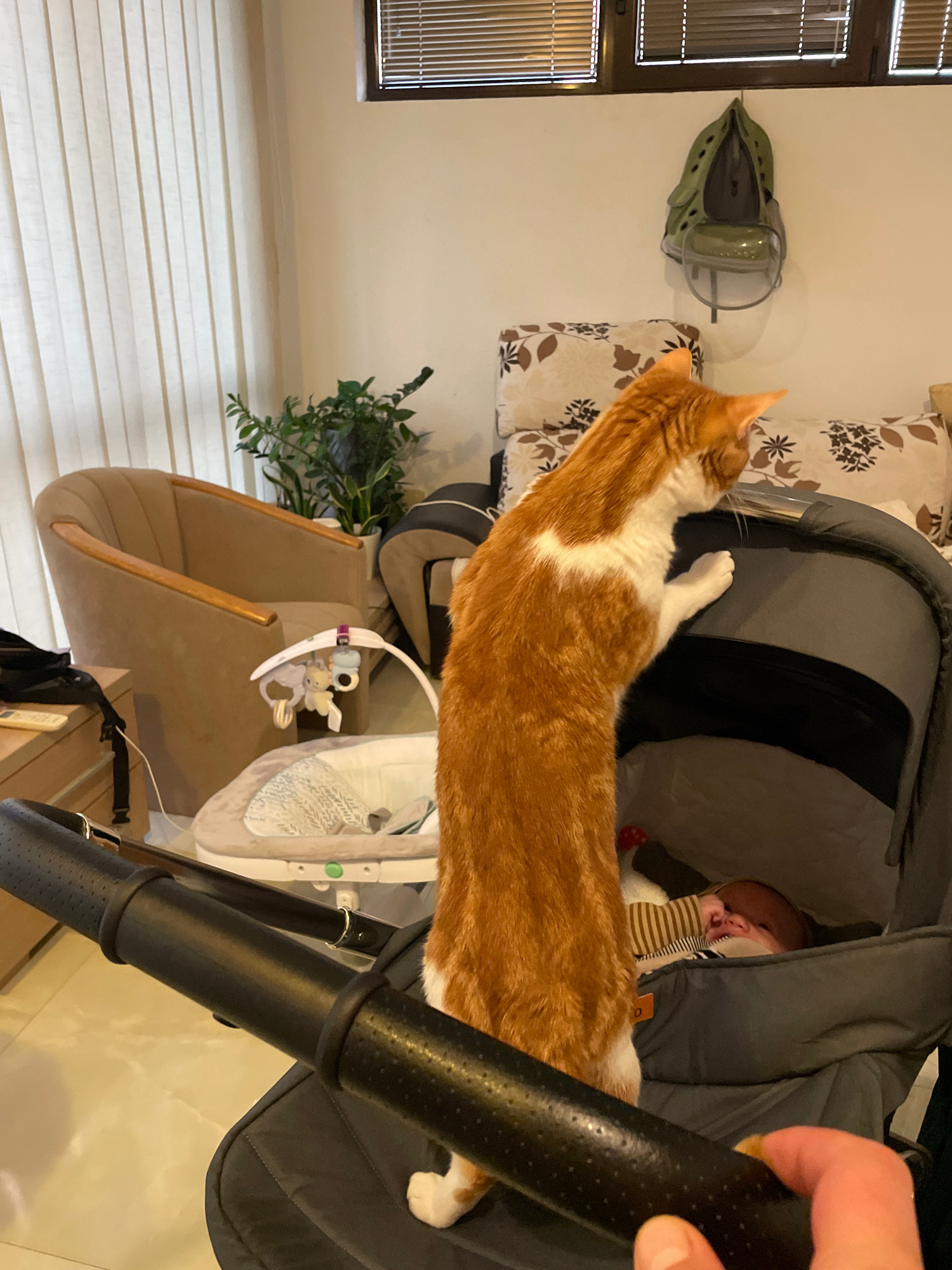 The image depicts an interior scene, possibly a residence. A red and white cat is positioned on a grey baby stroller or pram, with a baby partially visible inside. To the left, there's a window covere…read more