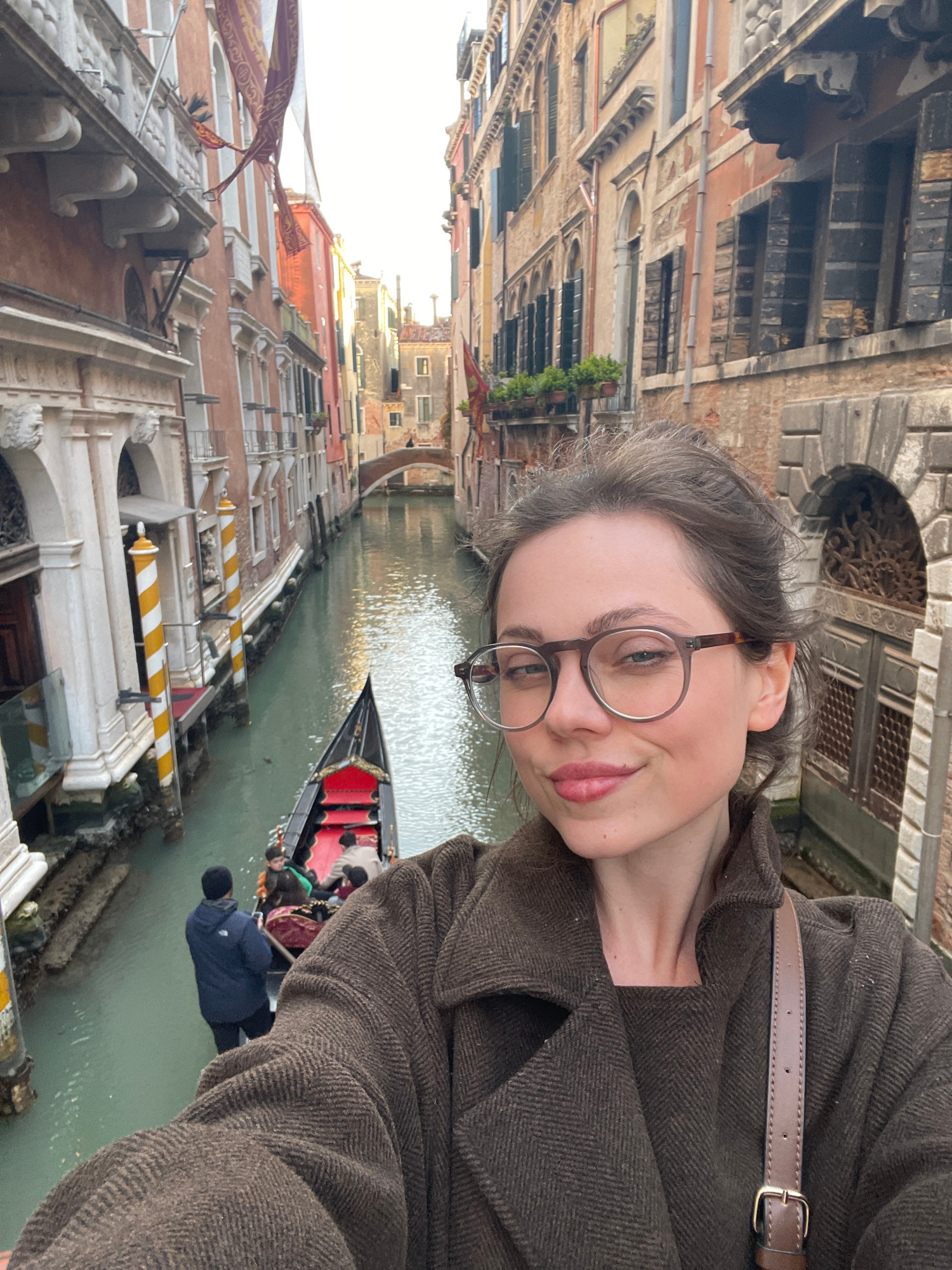 A person with glasses and a brown coat is taking a selfie on a bridge in Venice, Italy. The background shows a canal with a gondola carrying passengers. Buildings line the canal with architectural detβ¦read more