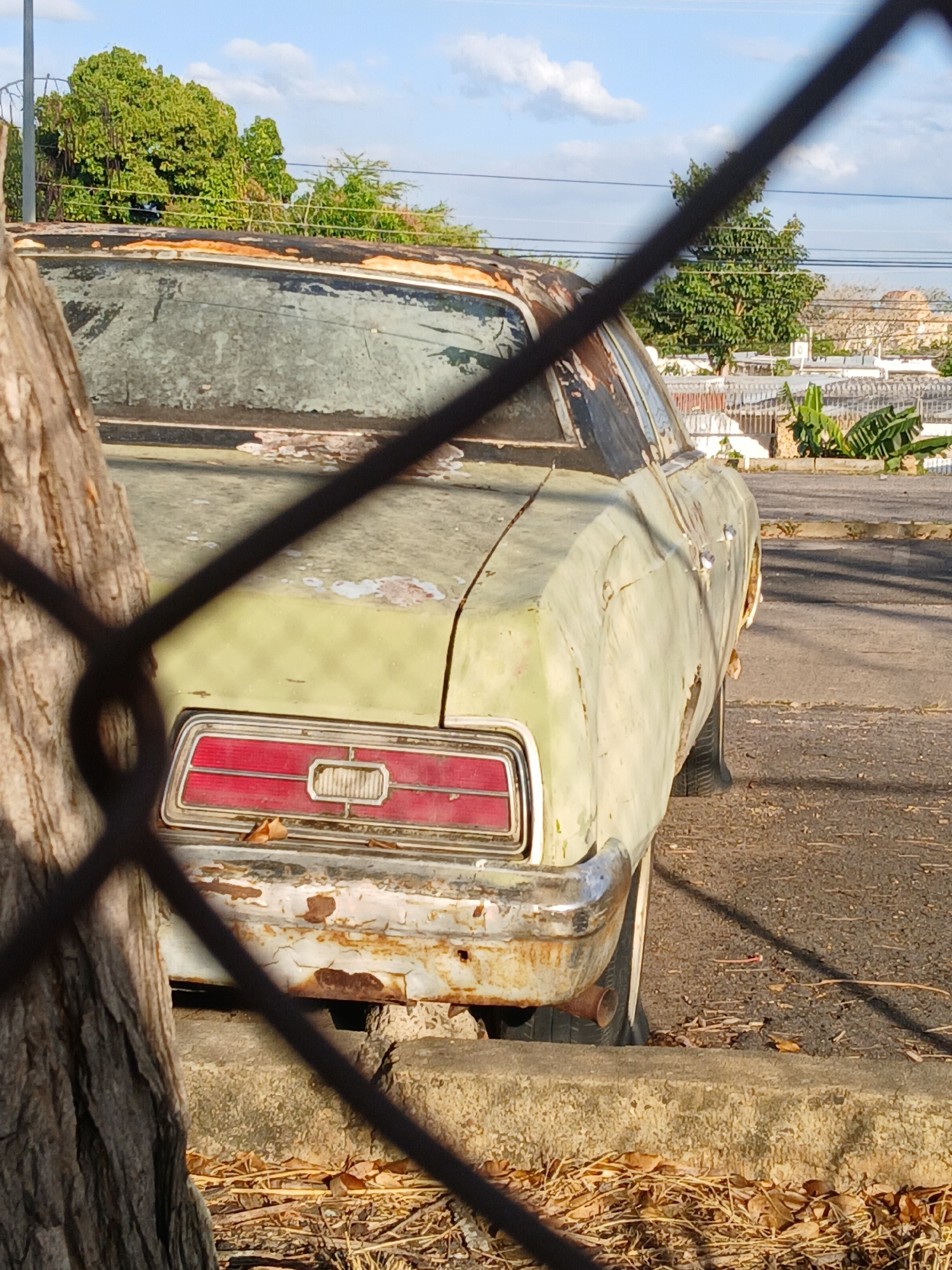 The image depicts an old, dilapidated car parked on a street in Guayana City, Venezuela. The car is visible through a wire fence and is heavily rusted with peeling green paint. The rear of the car isβ¦read more