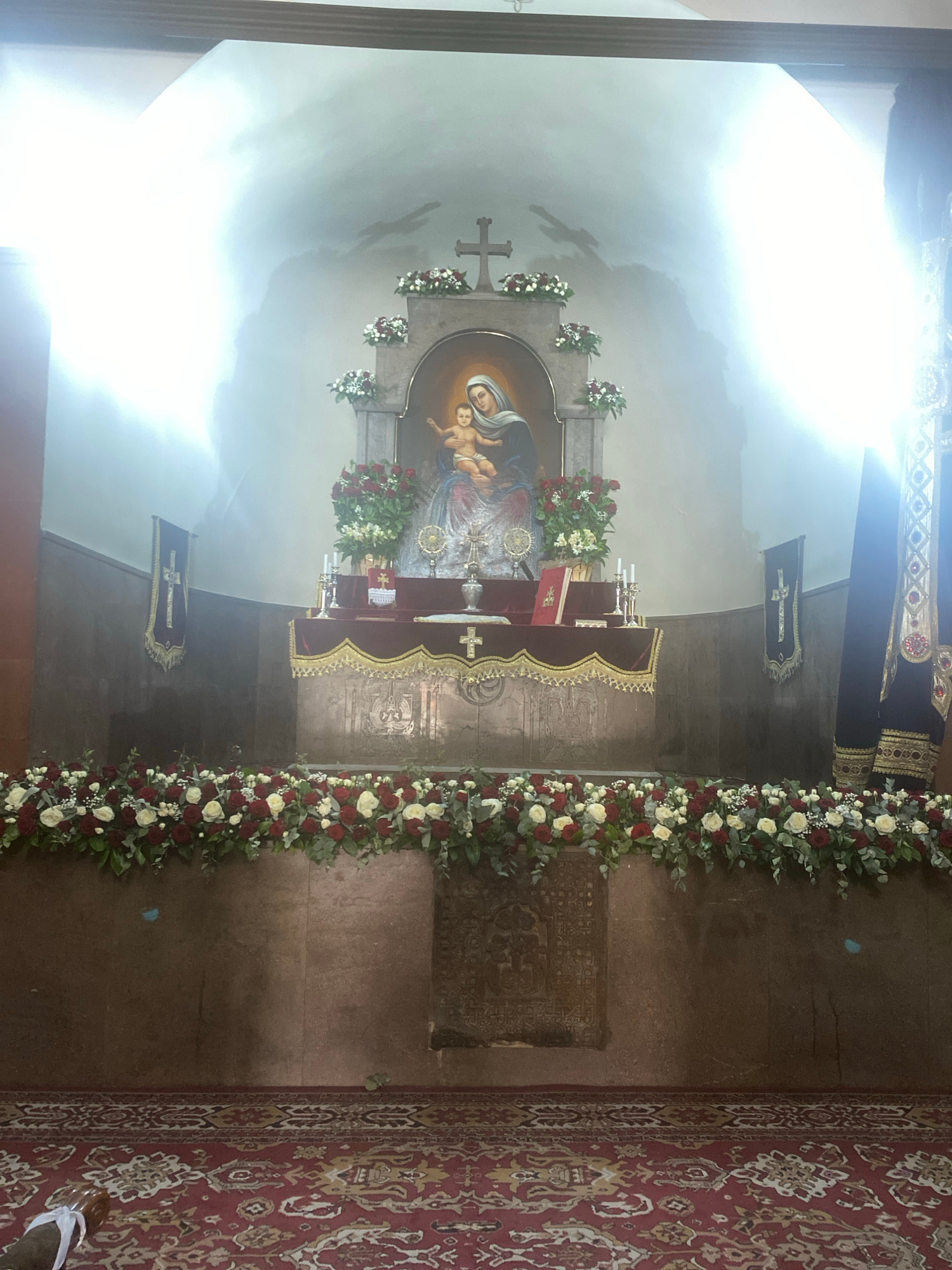 The image shows the altar area of what appears to be a church or religious building. The altar is adorned with flowers (red and white roses primarily). Above the altar is a painting of a religious fig…read more