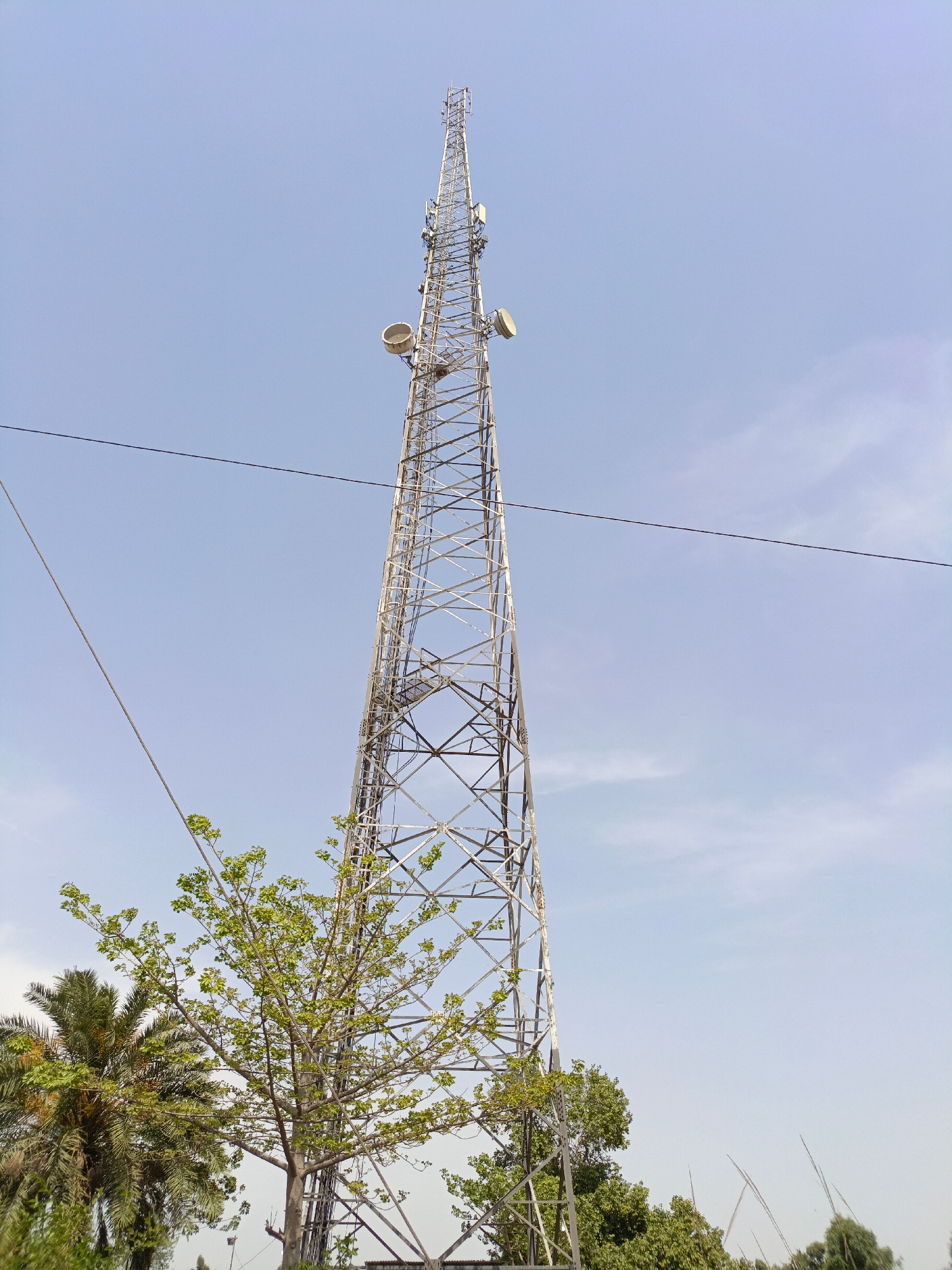 A tall, metal lattice communication tower stands prominently, extending high into a clear, light blue sky. The tower is equipped with multiple antennae and two large, round dish-shaped antennae; one i…read more