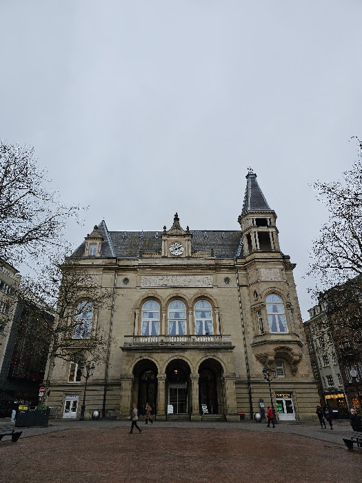 An external, eye-level photograph depicts the Cercle Cité building, located on Place d'Armes in Luxembourg City, Luxembourg, under an overcast sky. The prominent, multi-story structure is constructed…read more