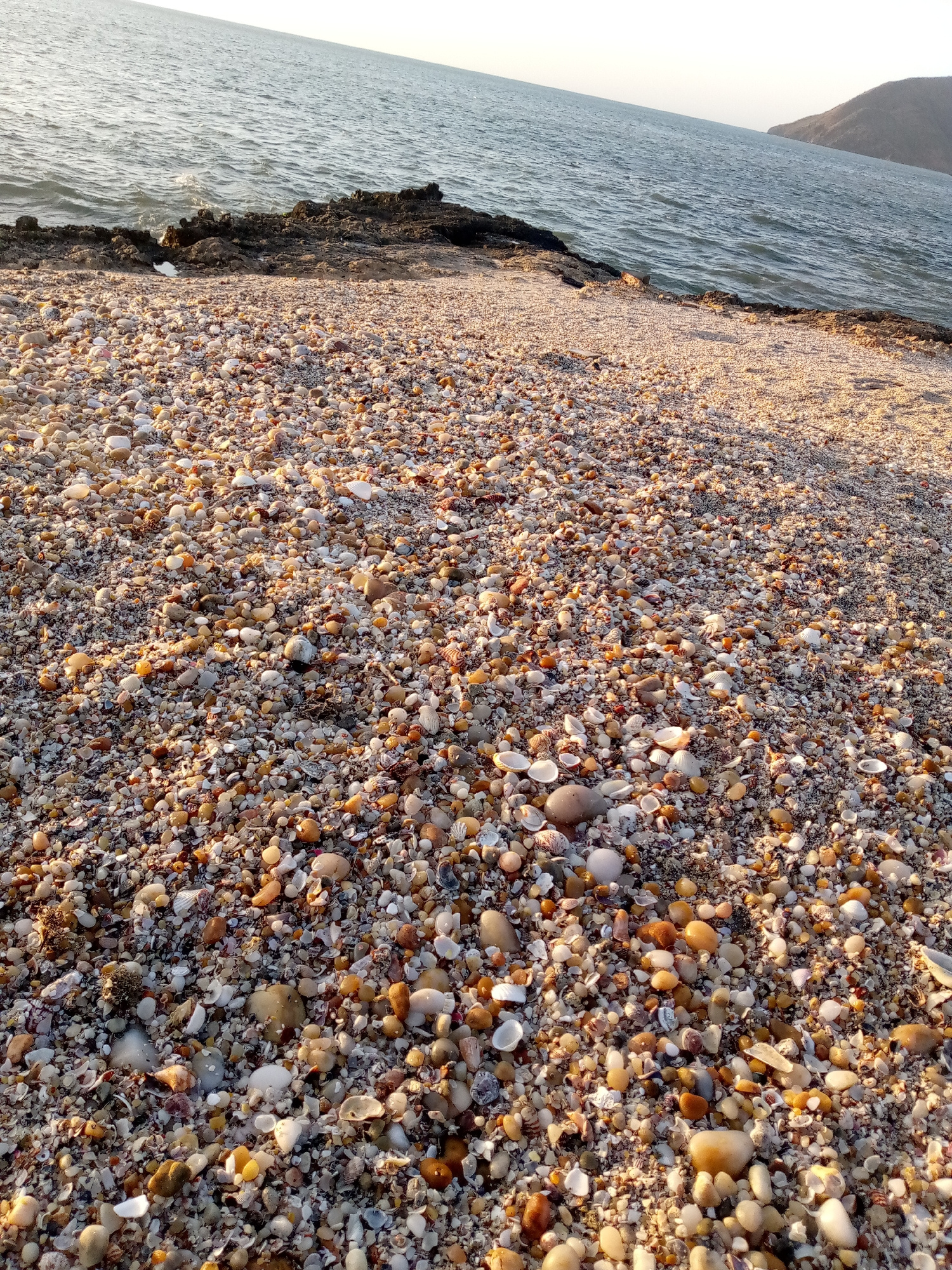 The image depicts a beach with a close-up view of shells and small rocks covering the sand. In the background, the ocean extends to the horizon, with land visible on the right side. The scene appears…read more