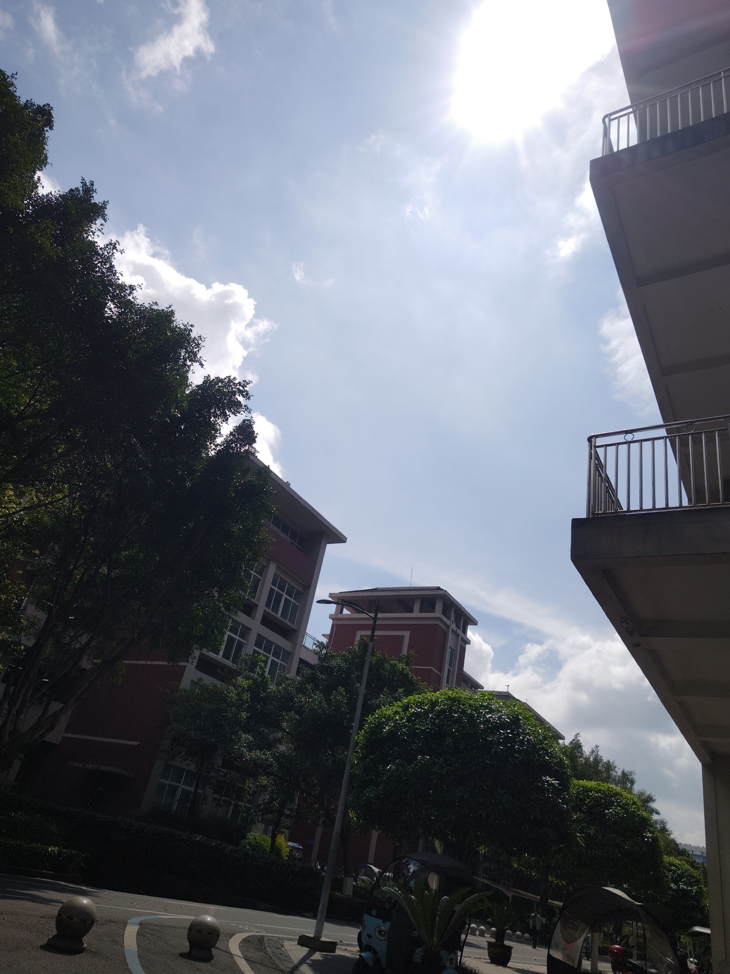 The image, likely taken in the Chongqing High-tech Zone, China, shows a view looking upwards. A multi-story red building with rows of windows is partially obscured by trees. Above, a section of a conc…read more