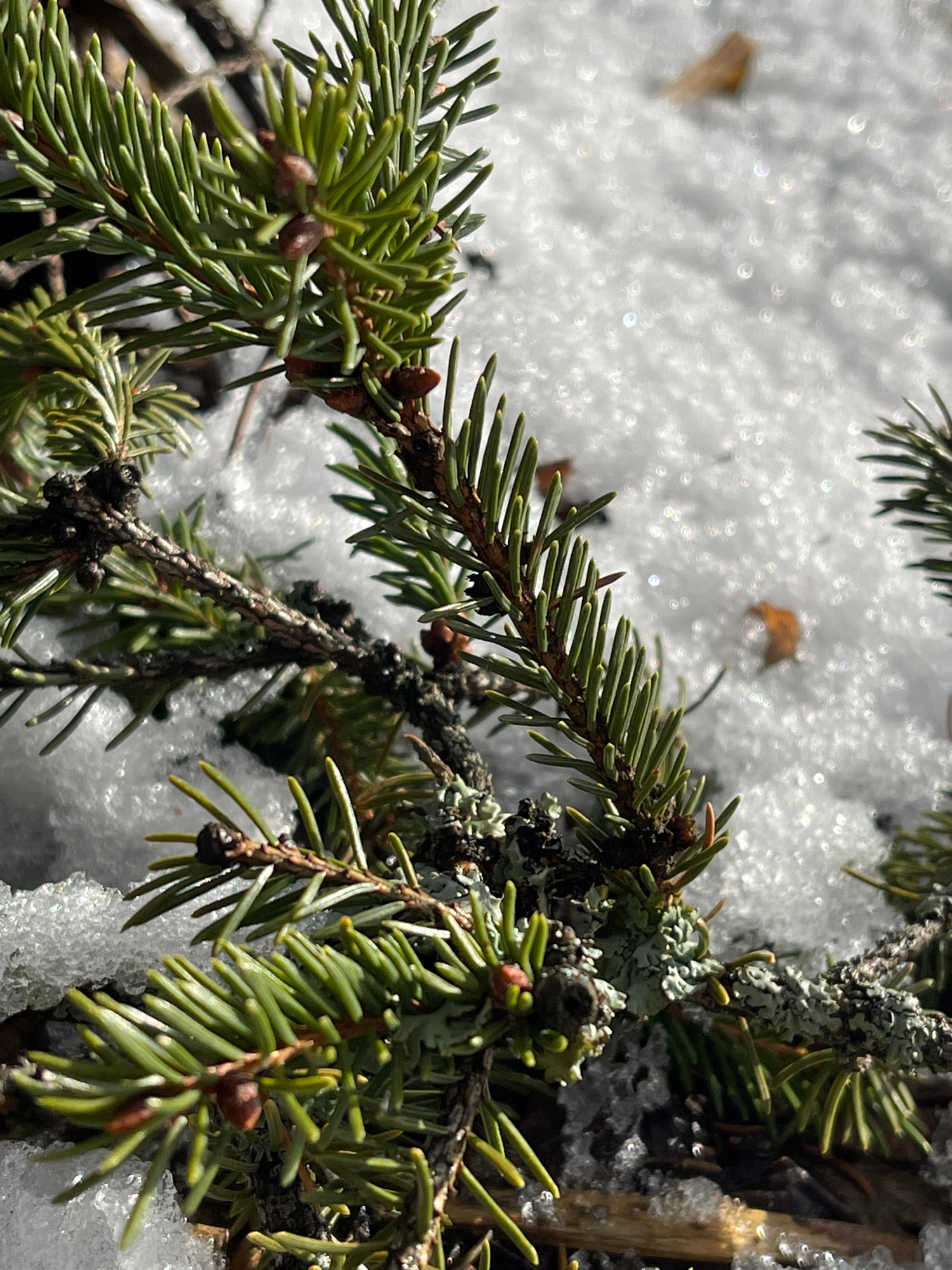 A close-up shot depicts coniferous branches partially covered in snow. The needles are green and healthy-looking. The branches are dark brown and gnarled, with some covered in grey-green lichen. Patch…read more