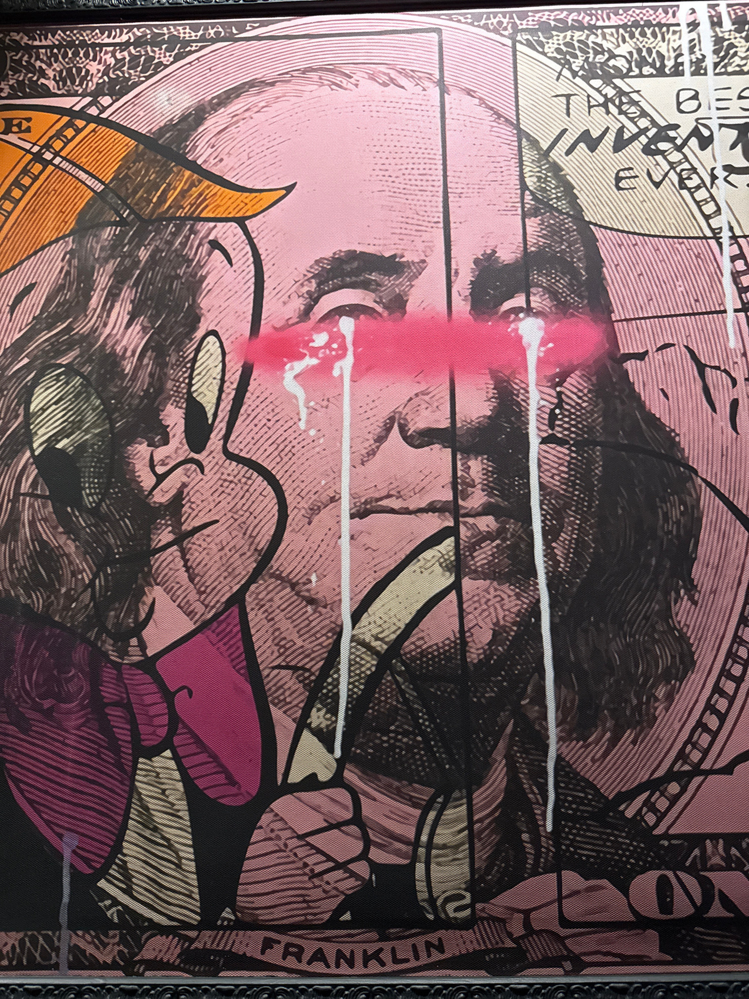 The image depicts a stylized portrait of Benjamin Franklin, rendered in pink, black, and gold tones with screen-printed textures. The word "FRANKLIN" is visible along the right edge. There is a red stβ¦read more
