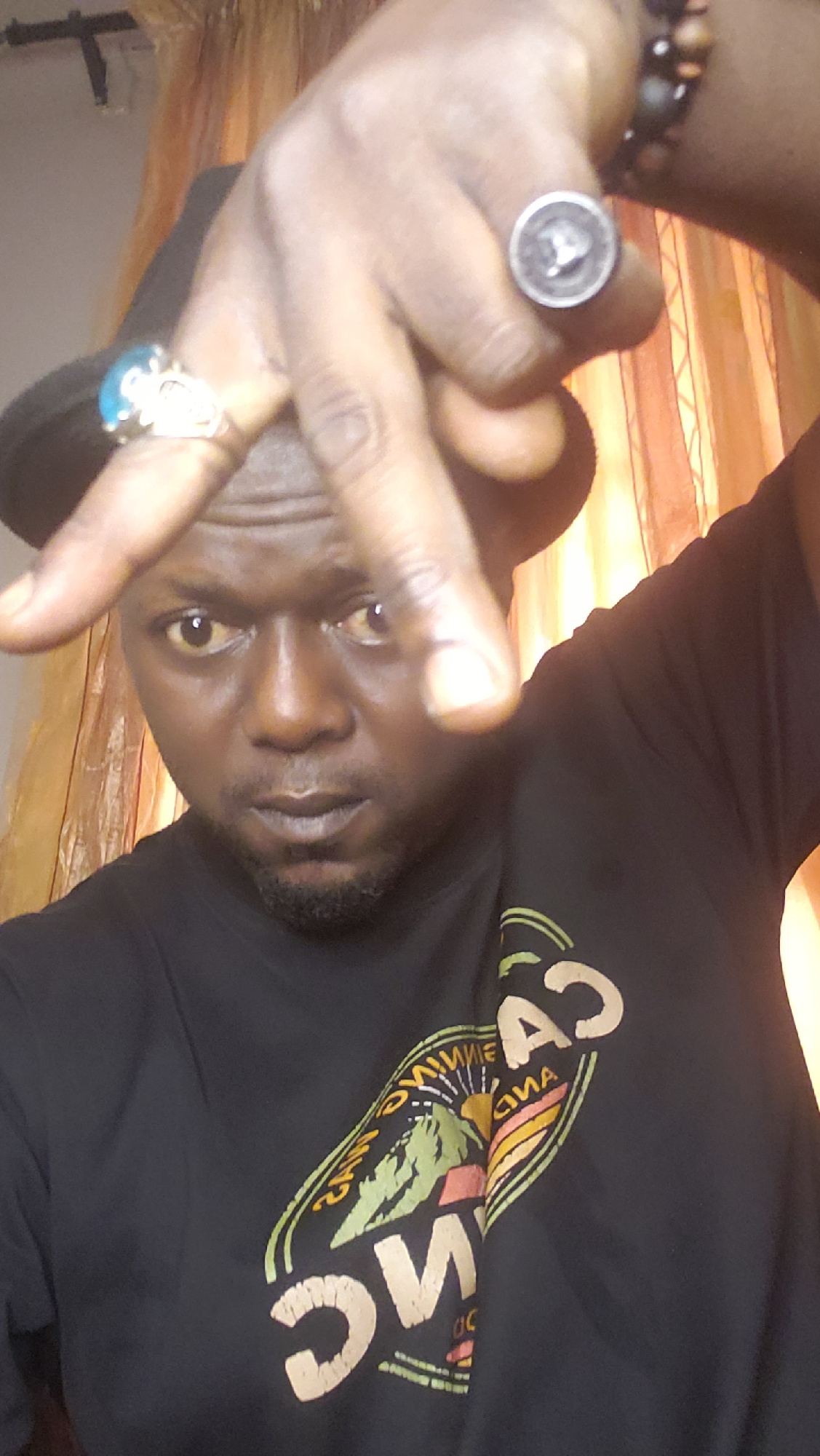 A dark-skinned man with a short beard and a black t-shirt is visible. The shirt has a graphic of mountains and a sun with the words "California Sunshine" in a stylized font. He wears rings on both han…read more