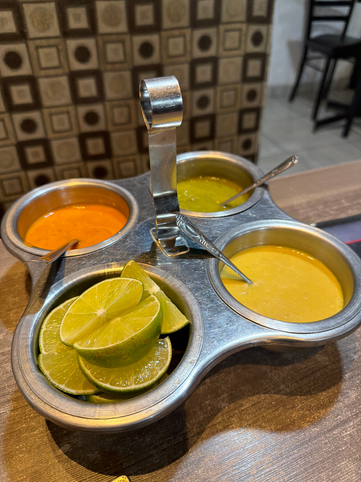 A metal serving dish containing lime slices and three types of sauces is situated on a table with a brown wood grain surface. Spoons are present in each of the sauce compartments. A silver-colored cli…read more