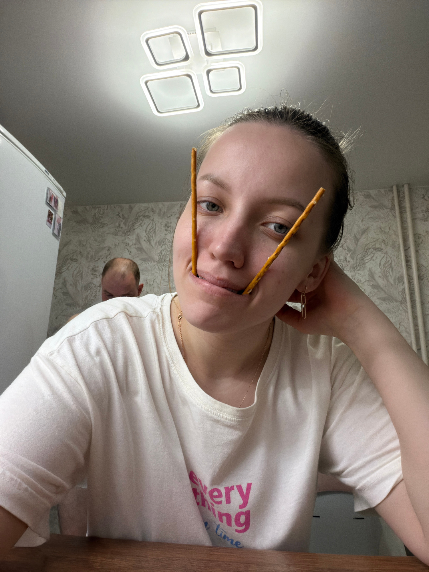 A person with light skin and hair pulled back is facing the camera, holding two breadsticks in their mouth. The background includes a light fixture, patterned wallpaper, a refrigerator, and another pe…read more
