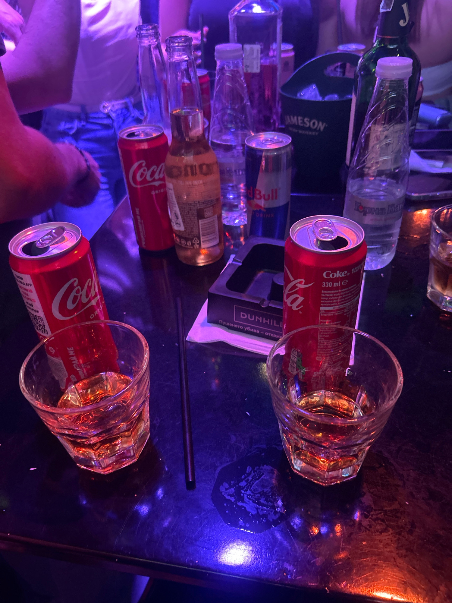 The image presents a cluttered tabletop scene in what appears to be a bar or club. There are multiple bottles and cans scattered around, including brands like Jameson, Red Bull, Coca-Cola, and a bottl…read more