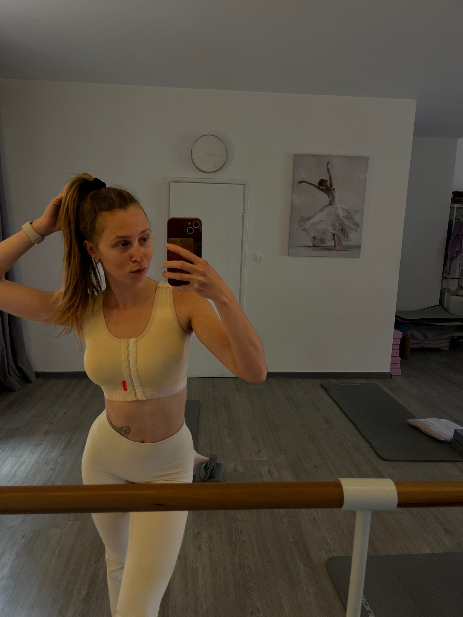 A woman is taking a selfie in front of a mirror, holding a phone in her right hand. She's wearing a beige sports bra with a front zipper and white leggings. Her hair is tied back in a ponytail. Behind…read more