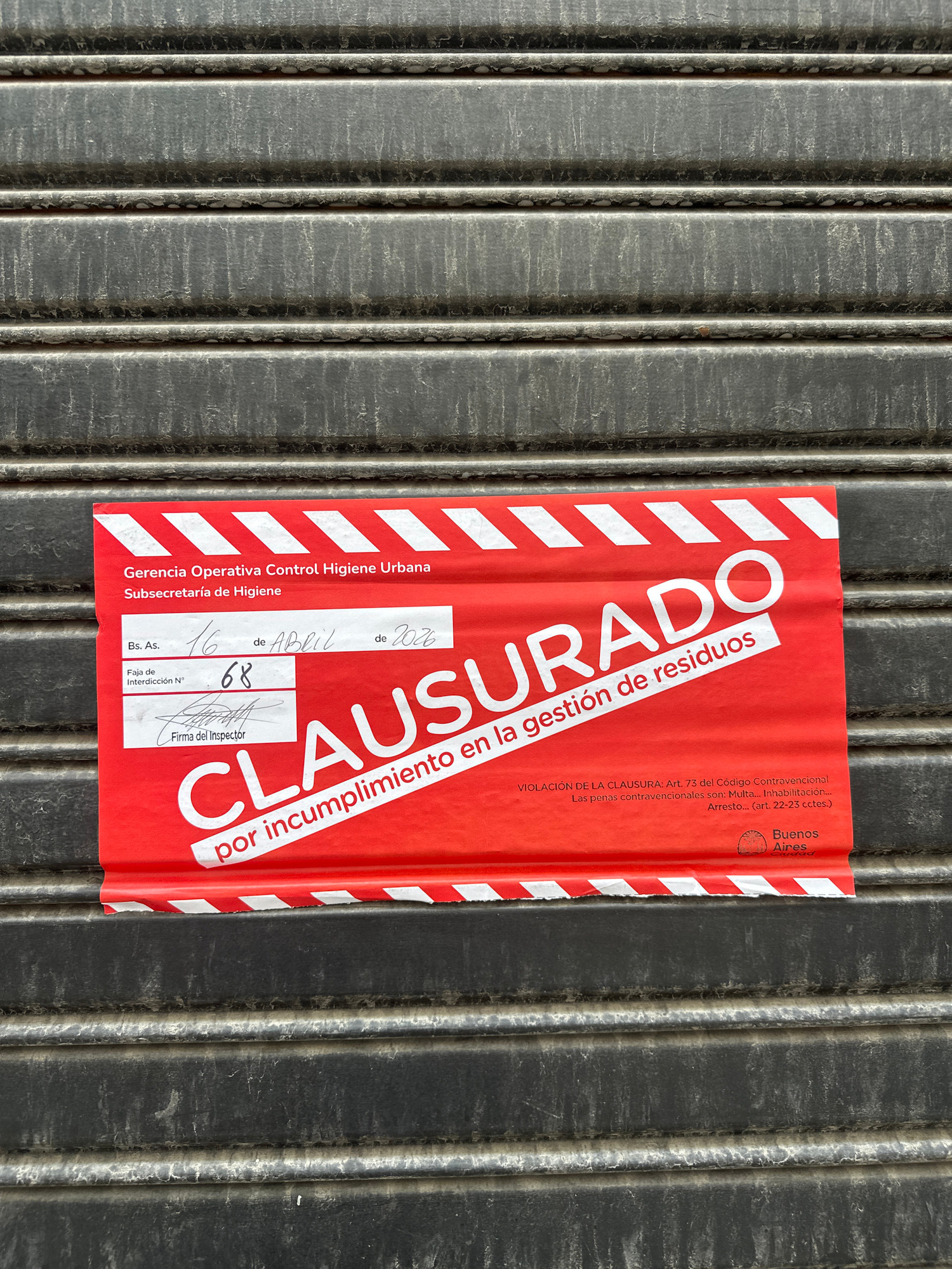 A red and white sticker is affixed to a dark, corrugated surface. The sticker reads "CLAUSURADO" (Closed) and "por incumplimiento en la gestión de residuos" (for non-compliance in waste management). I…read more