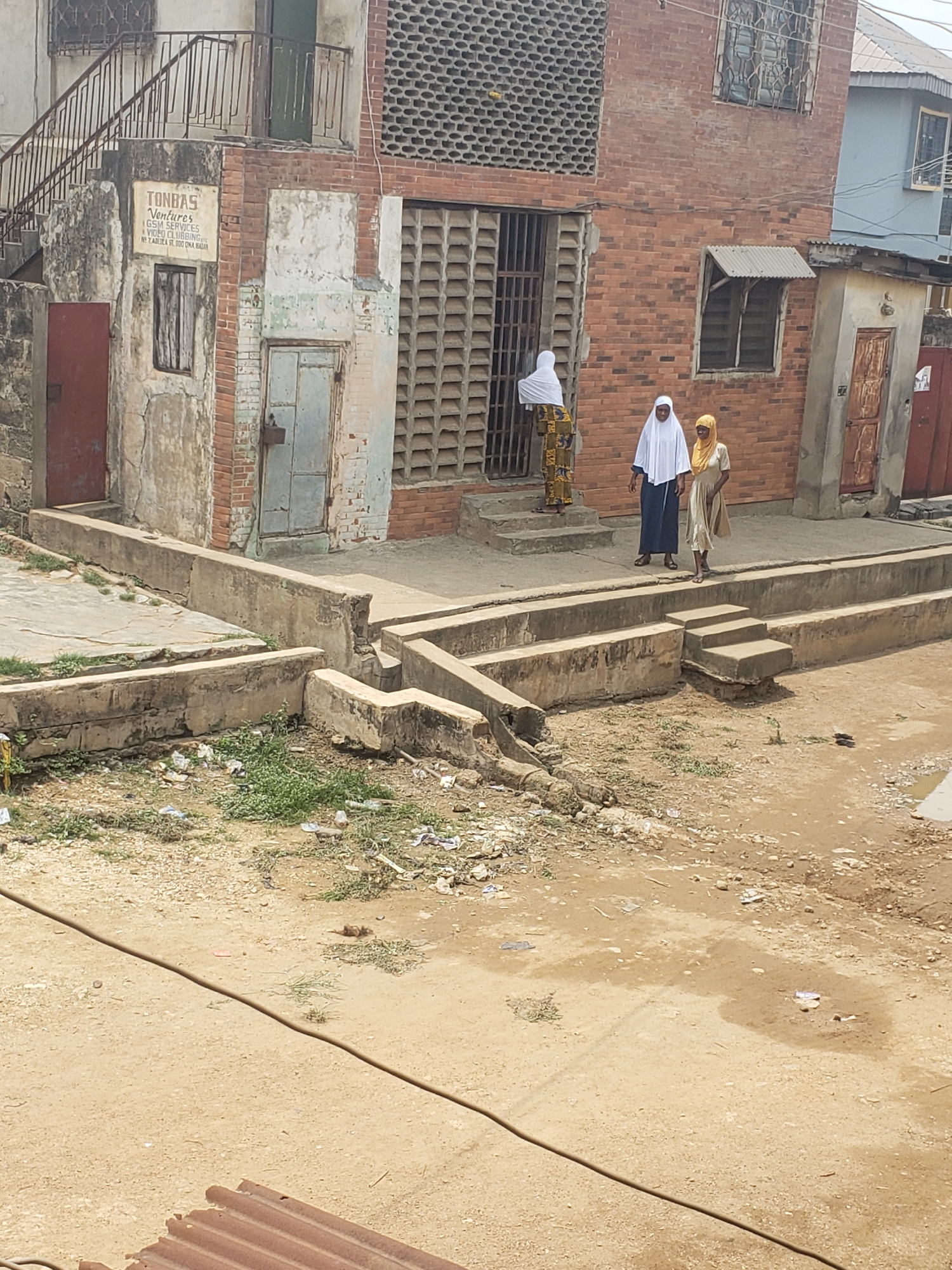 The image captures an outdoor scene in what appears to be a residential area in Alalubosa, Nigeria, under bright, clear daylight. The ground, predominantly sandy dirt with sparse patches of green vege…read more