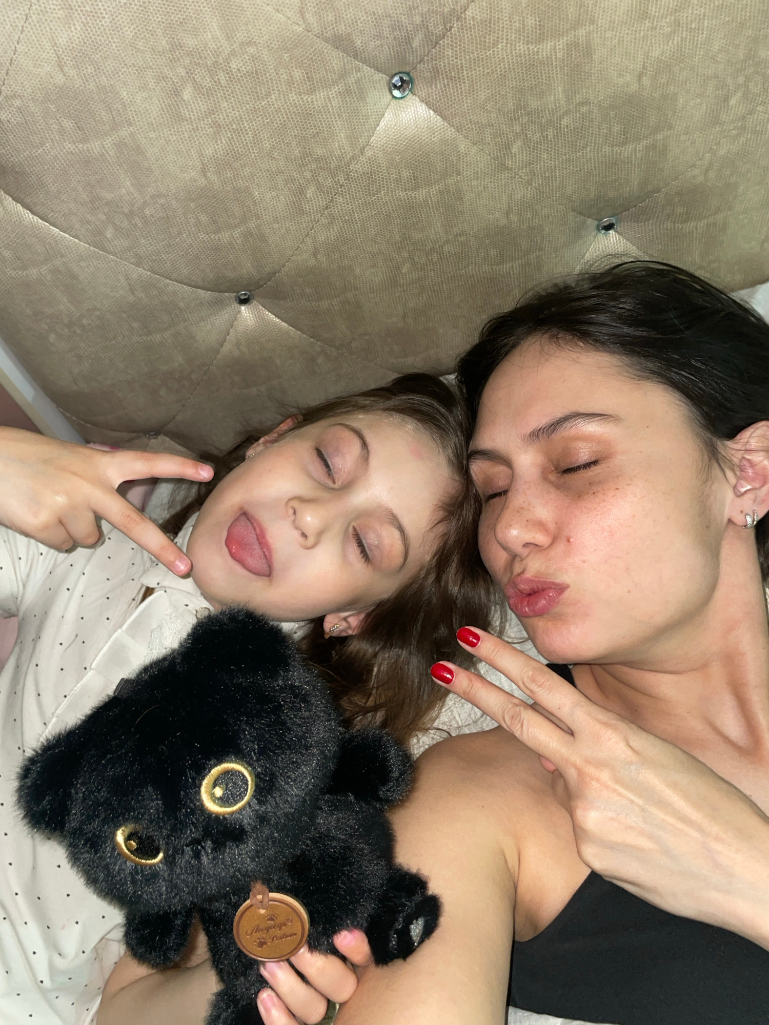A woman and a child are lying on a quilted bed. The woman is lying on her back with her eyes closed and lips pursed. Her dark hair is pulled back, and she is wearing a black top. Her right hand is rai…read more