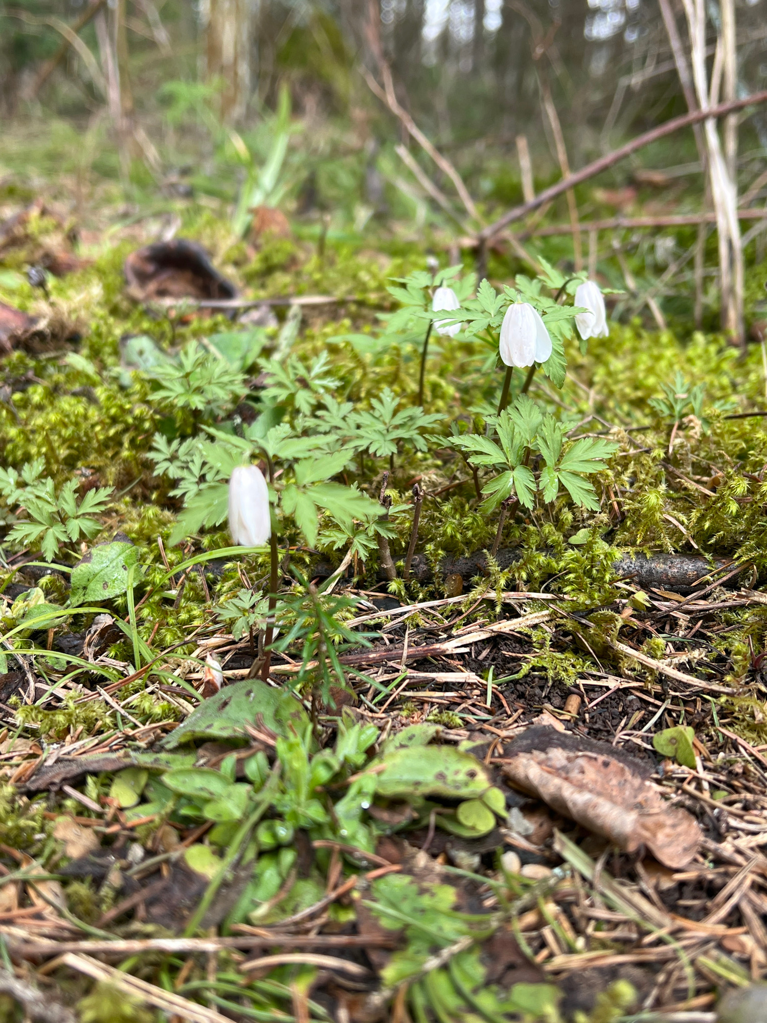 The image depicts a close-up view of a forest floor. Moss covers the ground, interspersed with fallen twigs, dead leaves, and various green plants. Several white flowers with closed petals and distinc…read more