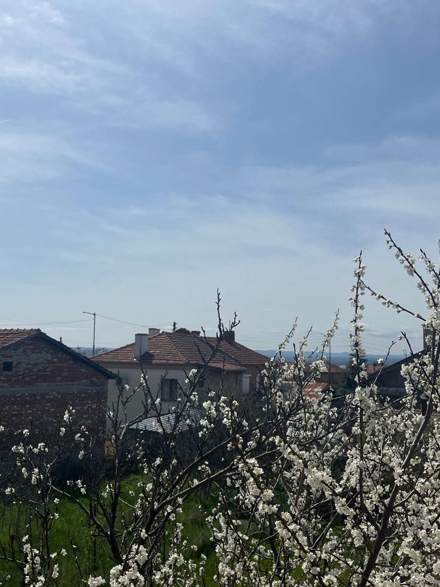 The image shows a row of houses partially obscured by a tree in bloom. The sky is blue with light clouds. The houses are brick and have tiled roofs. The tree has small white flowers. The location is l…read more