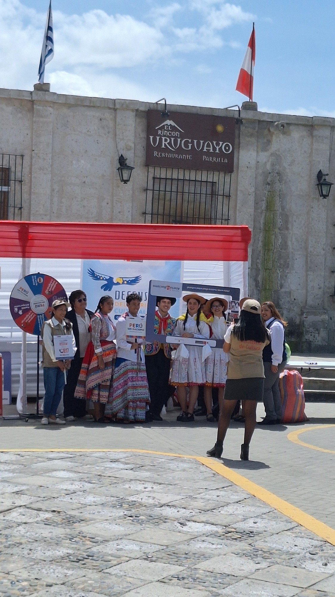 The image captures an outdoor cultural event in the Plaza de Yanahuara, Arequipa, Peru, in front of "El Rincon Uruguayo Restaurante Parrilla." The background features a light-colored, multi-story ston…read more