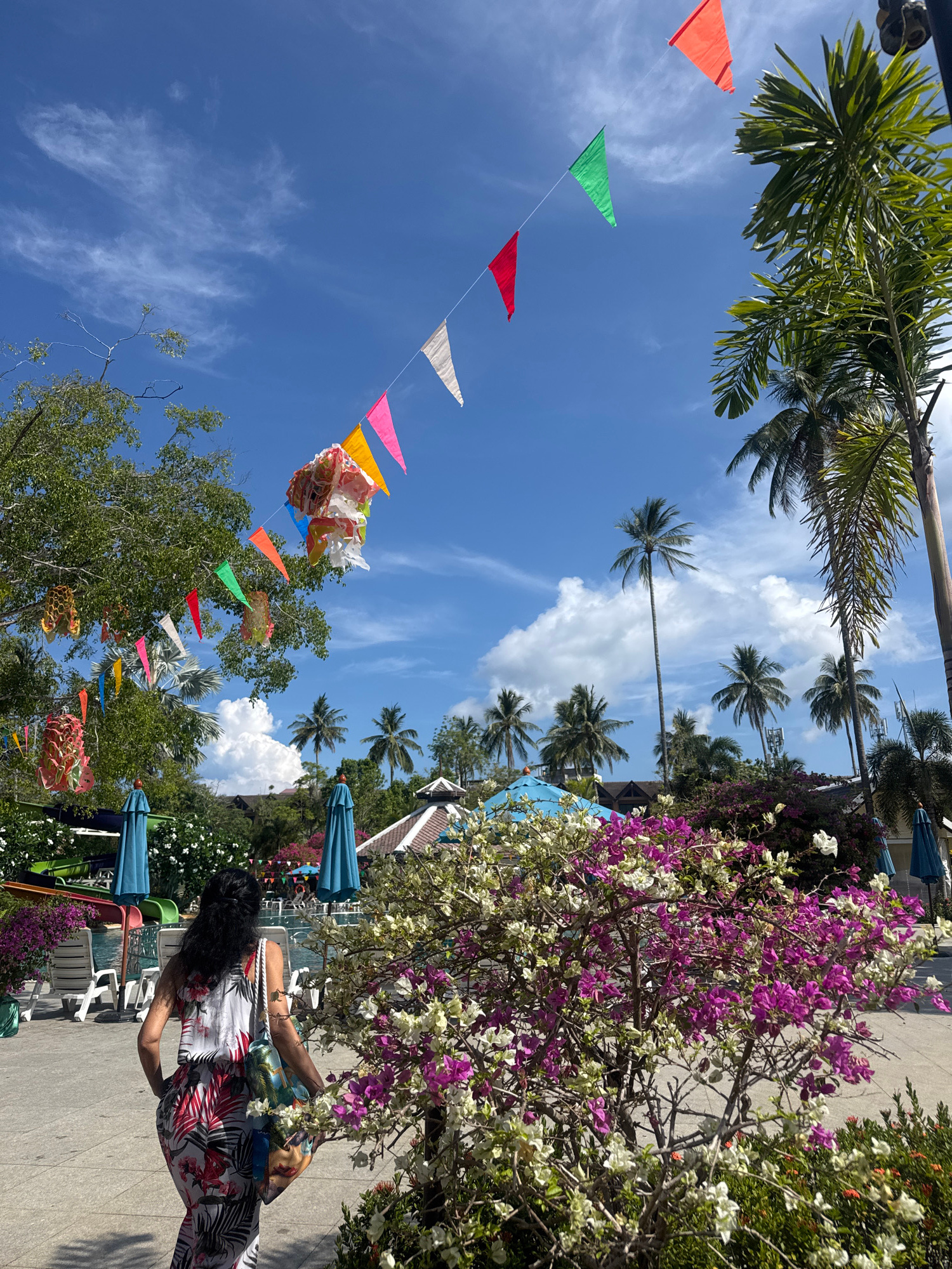 The image depicts a vibrant, tropical scene, likely in Patong, Thailand. The sky is a bright blue with scattered white clouds, visible between the tops of numerous palm trees. Colorful triangular flag…read more