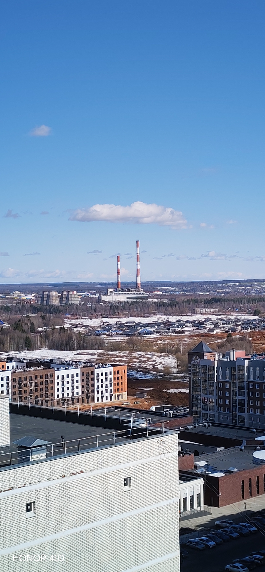 The image presents a high-angle view of a section of Izhevsk, Russia, on a clear day with a blue sky sparsely dotted with small clouds. The foreground is dominated by rooftops of buildings constructed…read more