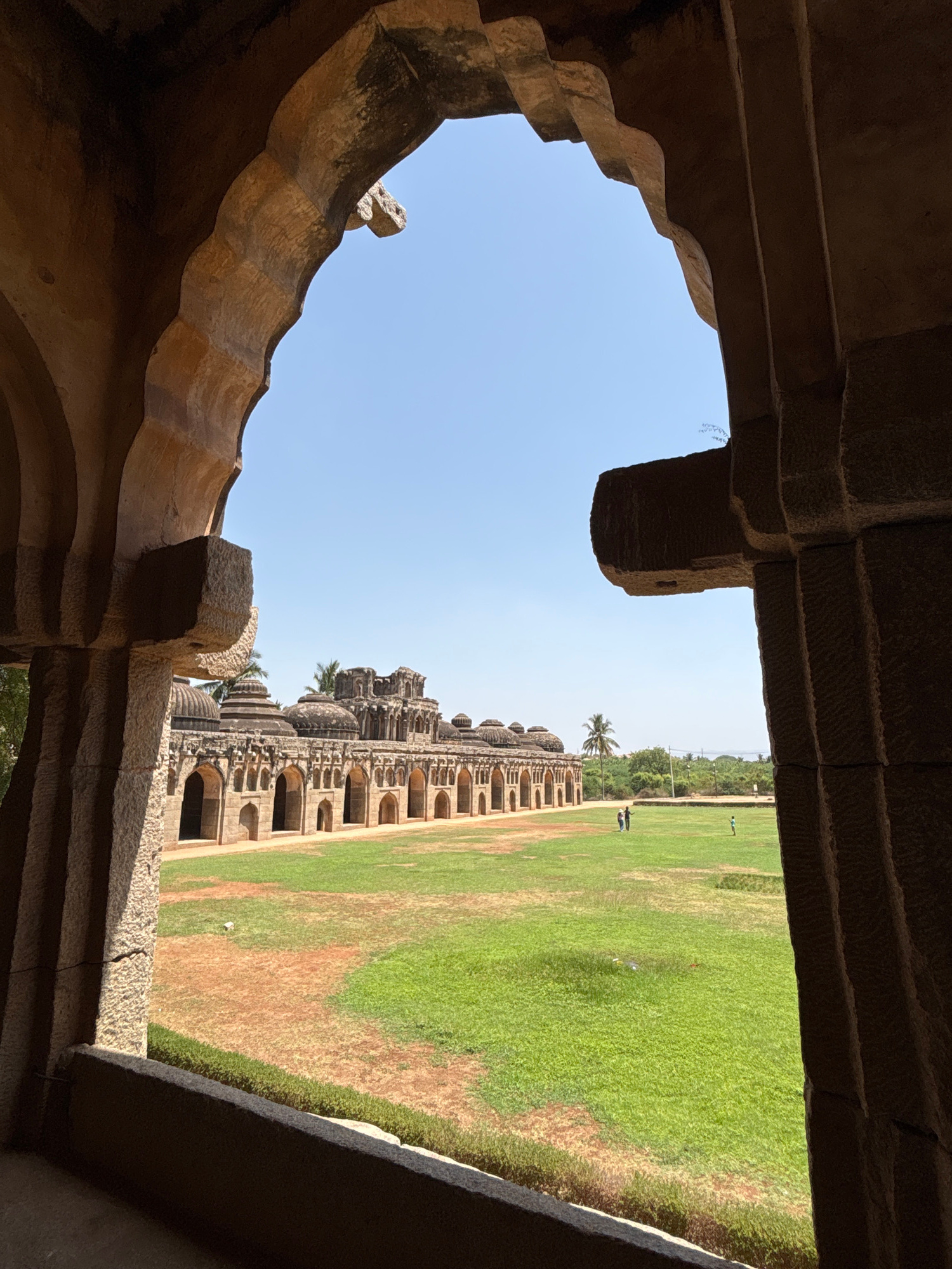 The image captures the Hazara Rama Temple Complex in Kamalapura, India, viewed through a stone archway. A partial view of the sky is visible through the archway's irregular opening. The complex itself…read more