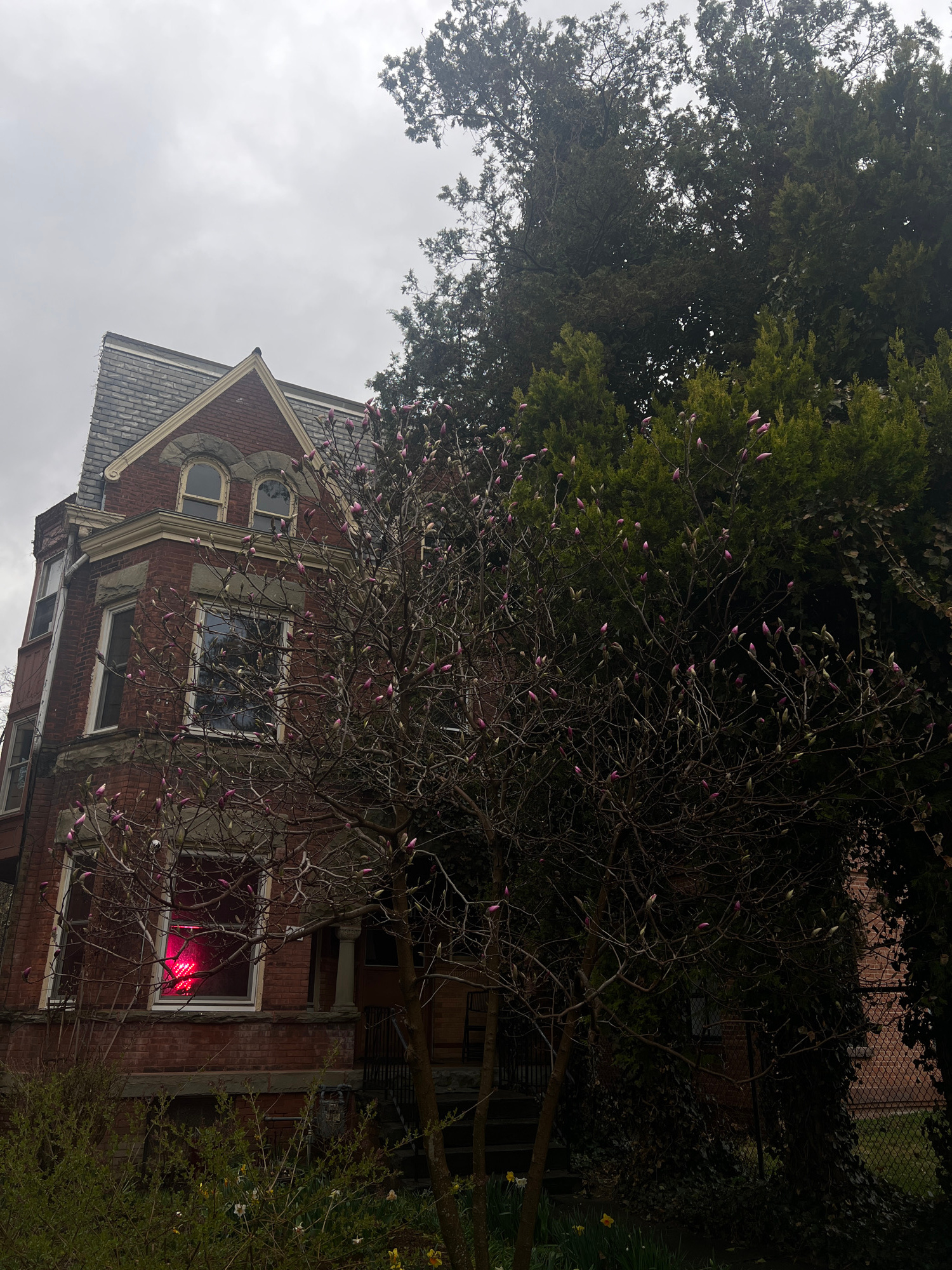 The image shows a residential scene with a brick building, likely a house, partially obscured by trees. The building has a gabled roof with gray shingles, and its facade features multiple windows, one…read more
