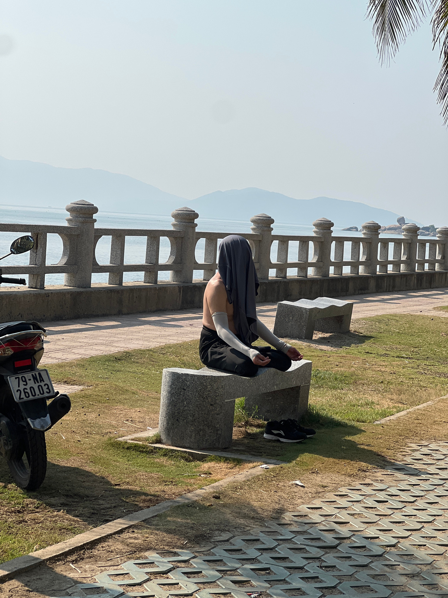 An eye-level, landscape-oriented photograph depicts a person meditating on a bench at Bắc Nha Trang, Vietnam, overlooking a body of water and the coast. The person, clad in a dark gray cloth draped o…read more
