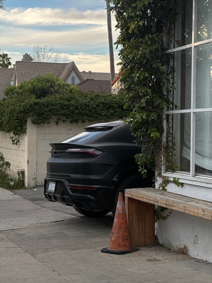A black car, possibly a Lamborghini Urus, is parked partially under a structure, near dense greenery. An orange traffic cone is wedged between the car's tire and the structure. A house is visible in t…read more