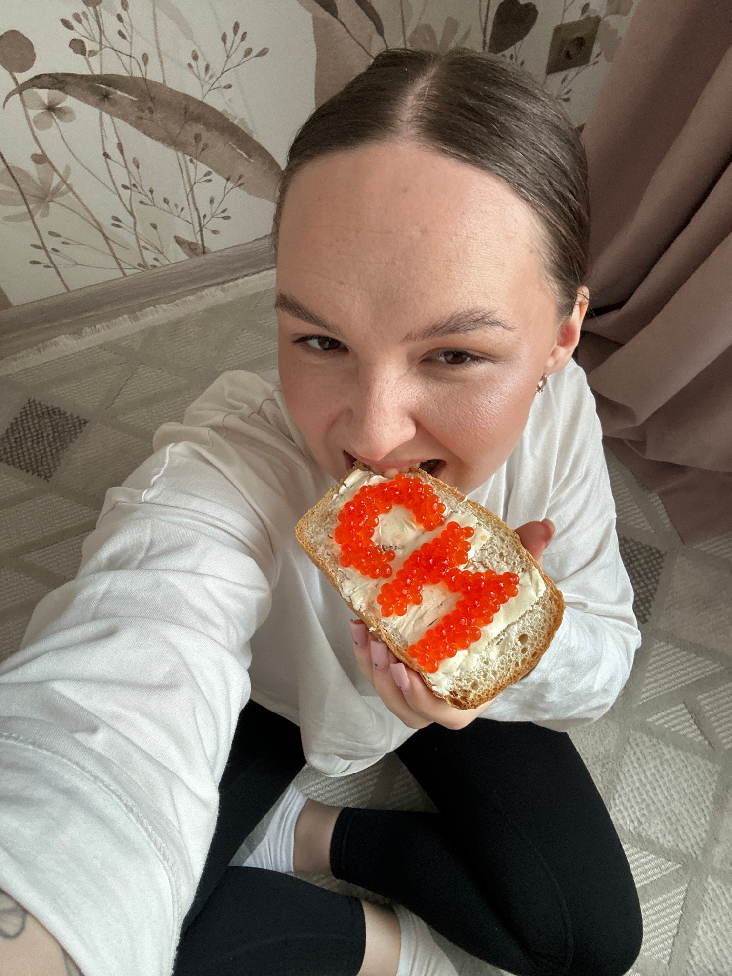 A selfie shows a woman indoors. She is holding a piece of bread spread with butter and topped with red caviar in the shape of the letters "OK." She has brown hair and is wearing a white t-shirt. The bβ¦read more