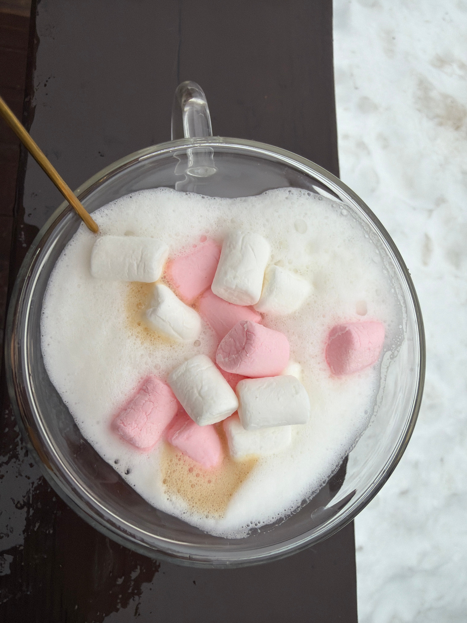 The image shows a clear glass mug filled with a white, foamy liquid, likely a beverage, with several pink and white marshmallows floating on top. A thin, light-brown stirring stick rests on the rim ofโ€ฆread more