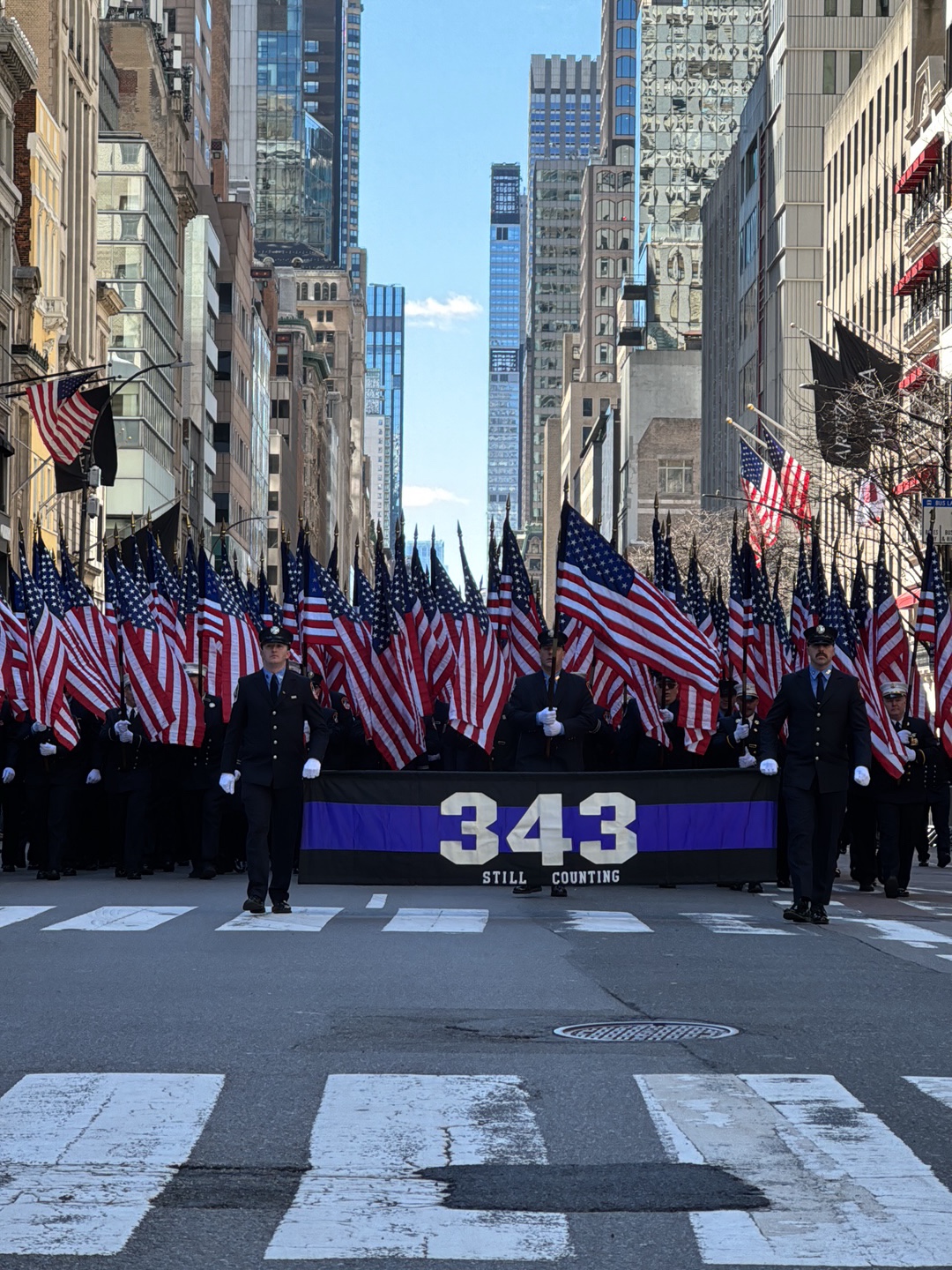 An outdoor daytime scene depicts a commemorative procession on an urban avenue in Midtown Manhattan, New York City, United States. The perspective looks south down a street lined with diverse architec…read more