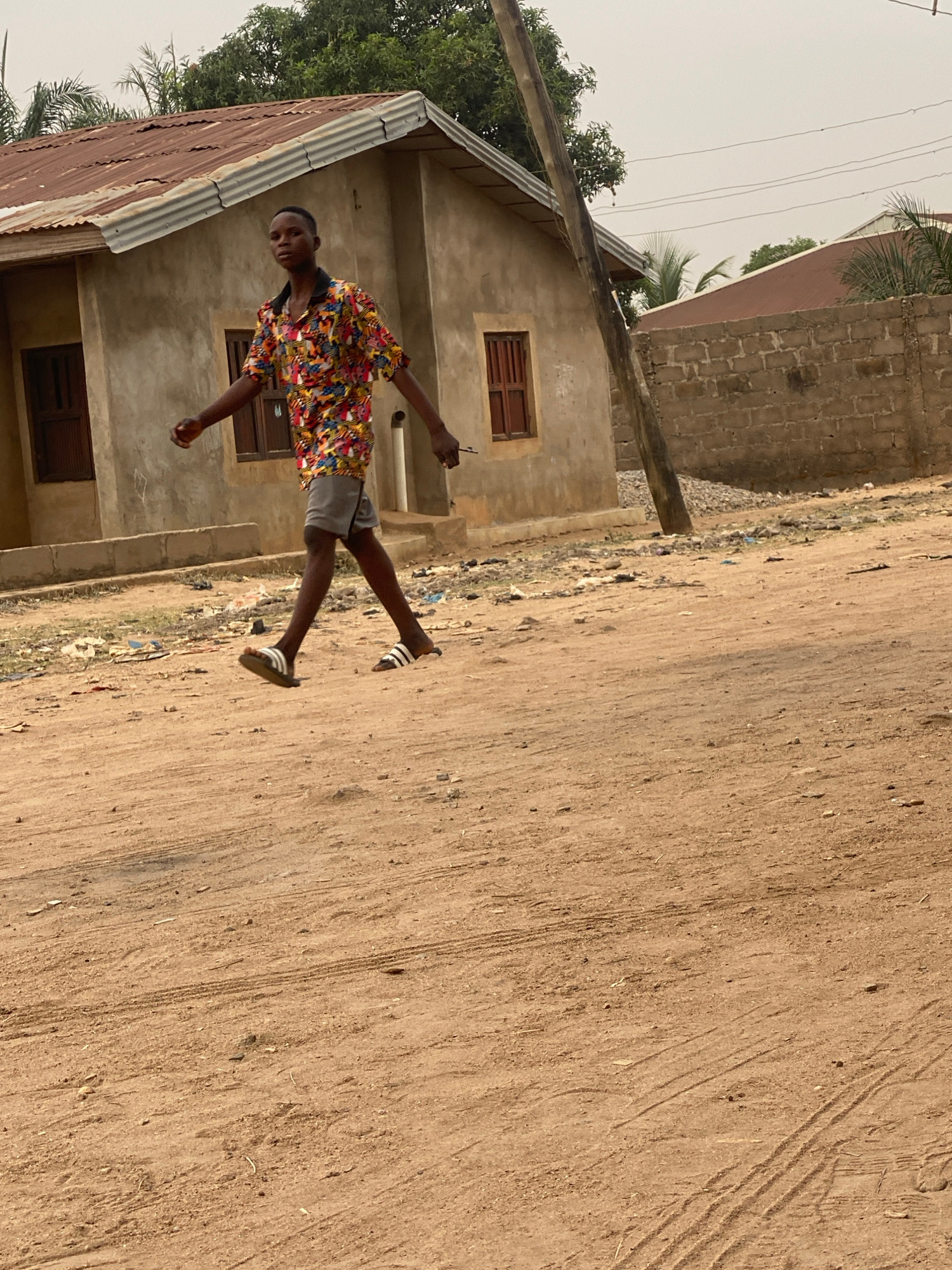 A young individual stands on a sandy, unpaved road in Sabon Tasha, Nigeria. The person is wearing a colorful, patterned shirt and gray shorts, with sandals on their feet. Behind them is a building wit…read more