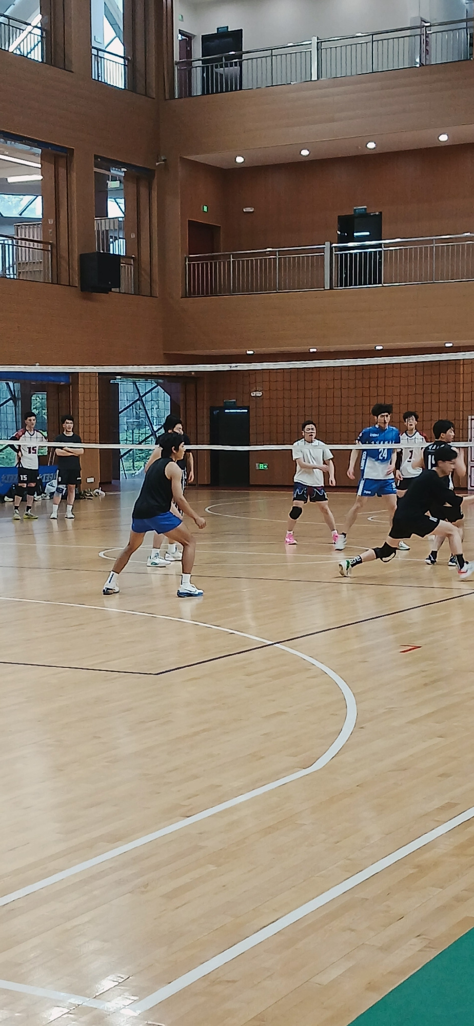 The image shows a volleyball game being played indoors on a wooden court. Several players are visible on both sides of the net, in volleyball attire. The environment appears to be a gymnasium or indoo…read more