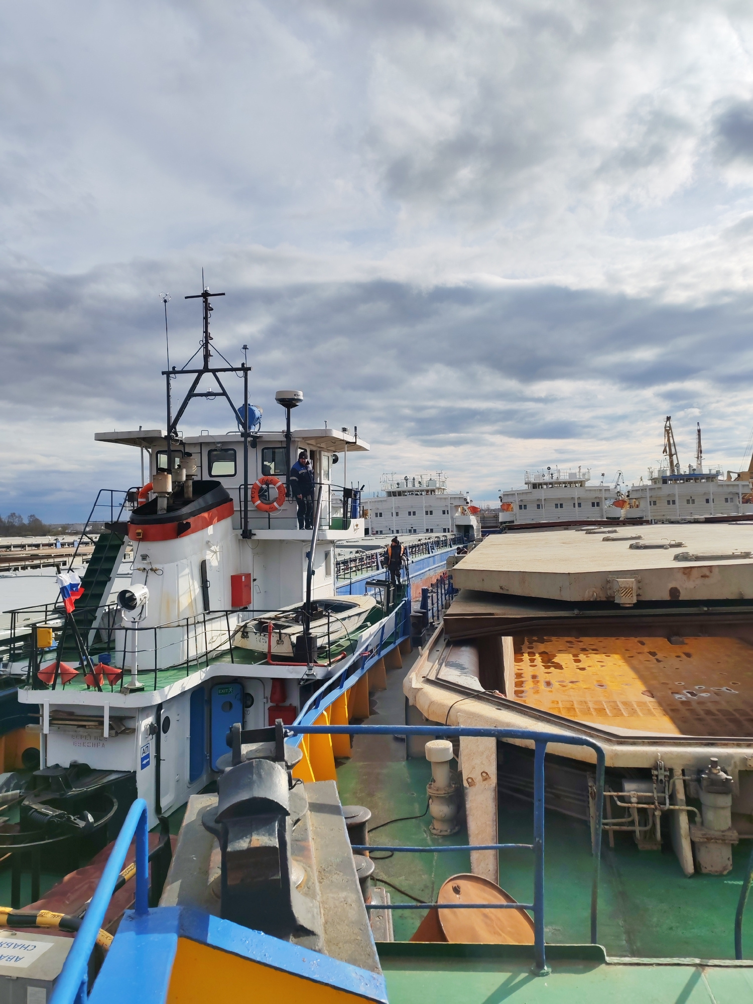 The image depicts a harbor scene in Rybinsk, Russia, under a cloudy sky. Multiple vessels are docked side-by-side. The foreground features the deck of one vessel, with blue and yellow painted railings…read more