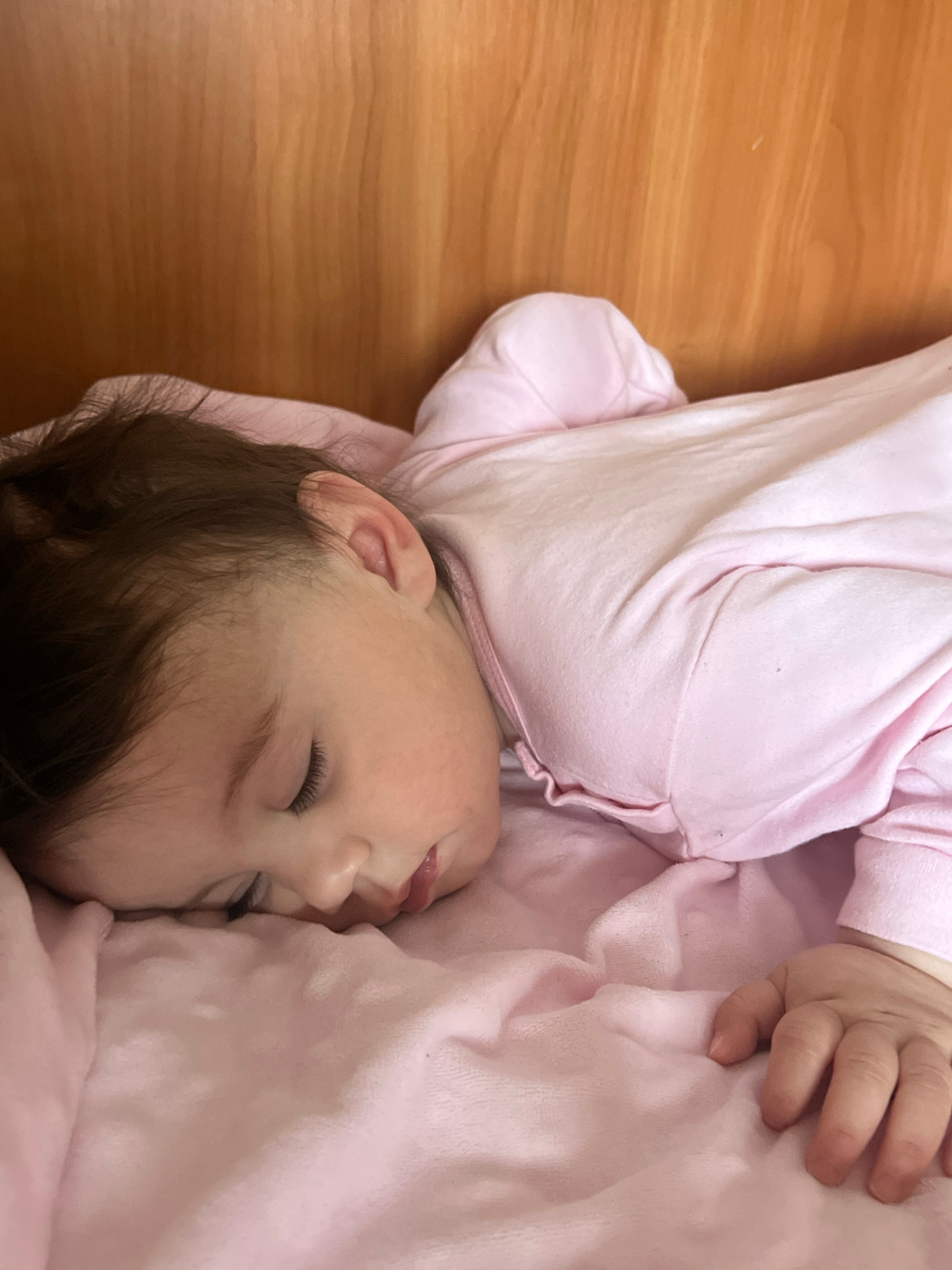 A baby is lying on its side on a pink blanket. The baby is wearing a pink outfit. The baby's eyes are closed, and its mouth is slightly open. The baby has dark hair and light skin. The blanket is wrin…read more