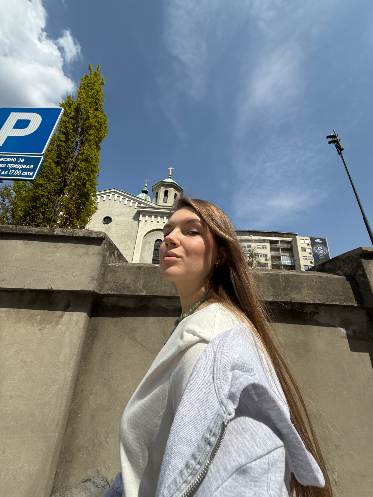 The image, originally rotated 90 degrees counter-clockwise, captures a young woman outdoors in an urban setting on a sunny day. In the foreground, on the right side of the frame, a woman with long, st…read more