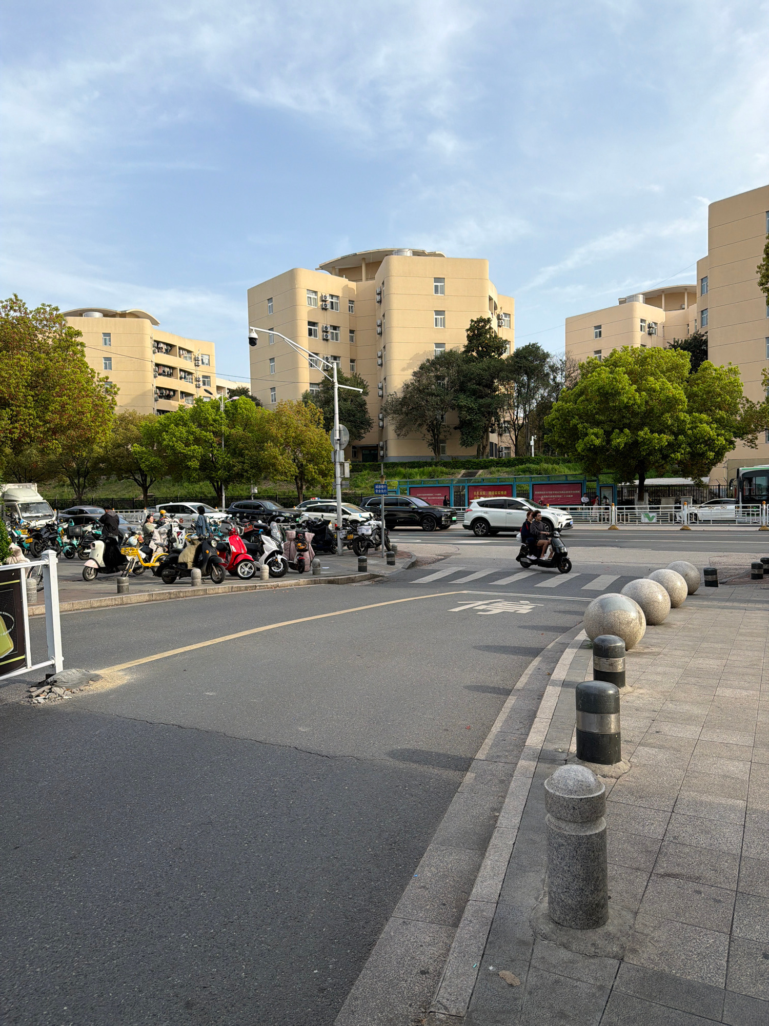 The image depicts a street scene in Jiangning District, China. Several multi-story, light-yellow buildings line the left side of the frame. The sky is light blue with scattered clouds. A street runs…read more