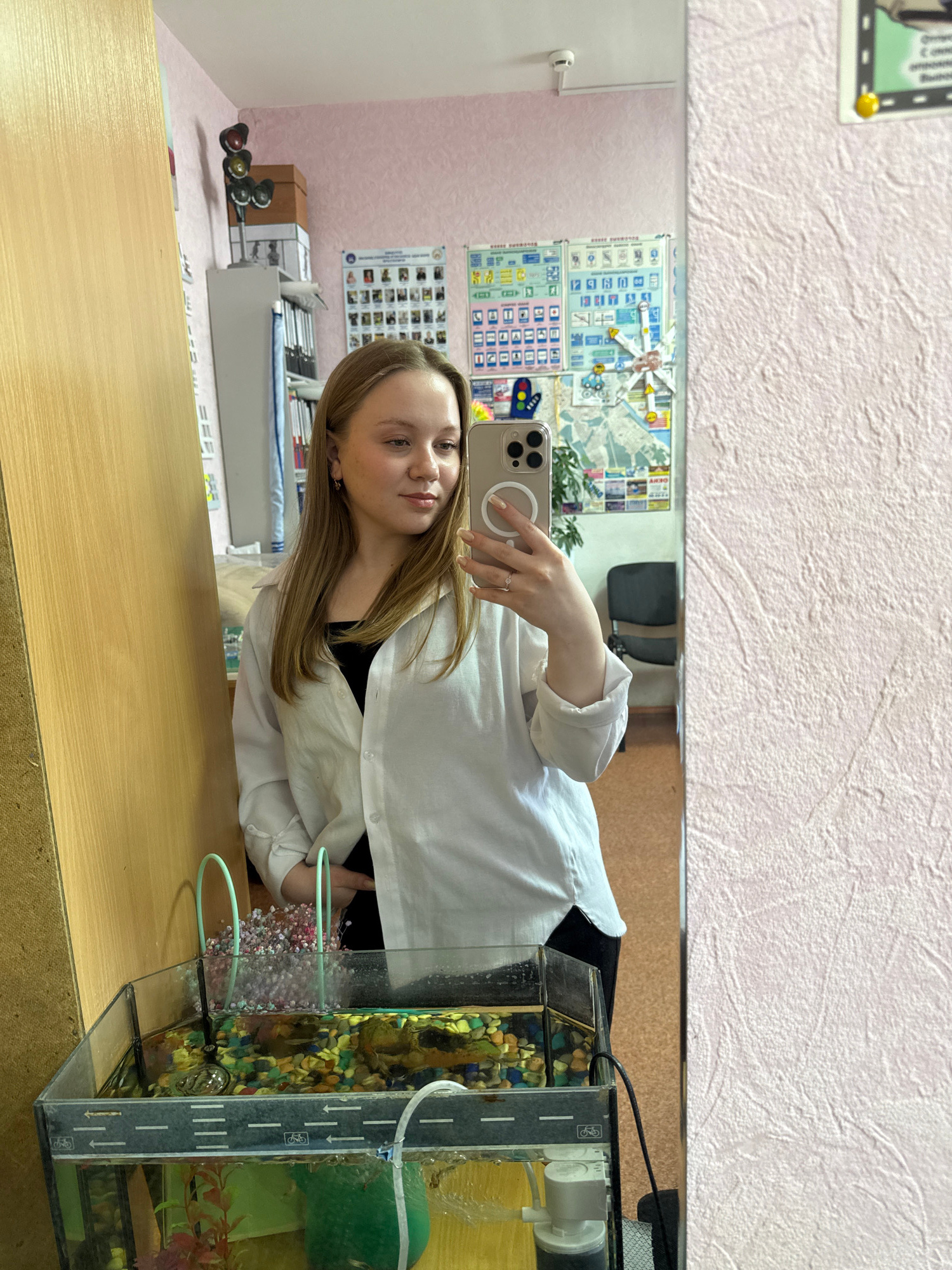 The image depicts a young woman taking a selfie in a mirror. She is wearing a white button-down shirt over a black top. Her hair is light brown and shoulder-length. She is holding a smartphone in her…read more