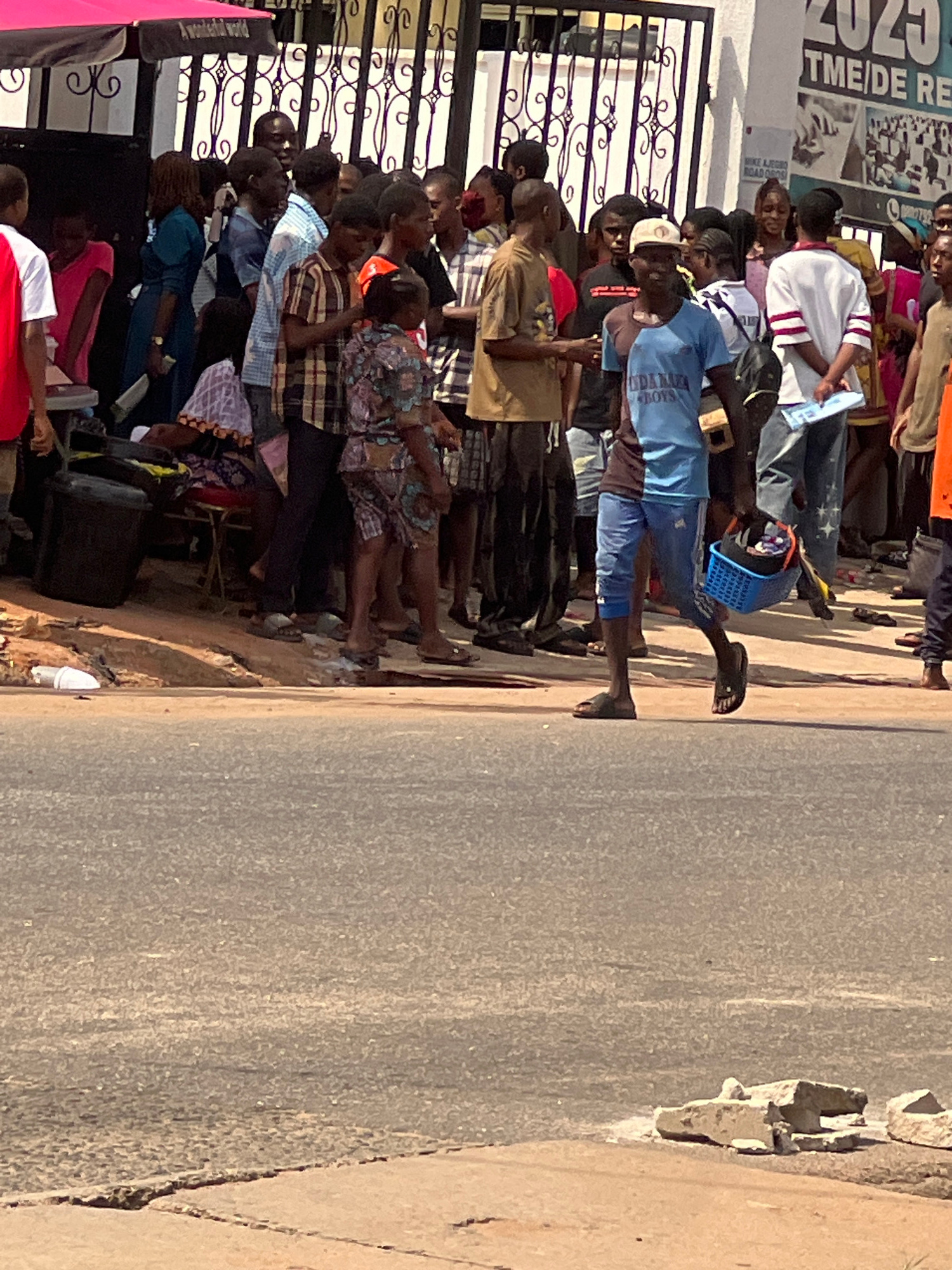 The image depicts a street scene in Nkpor, Nigeria, featuring a dense crowd of people gathered near a building with a poster on its exterior. Many people are standing in close proximity to each other,…read more