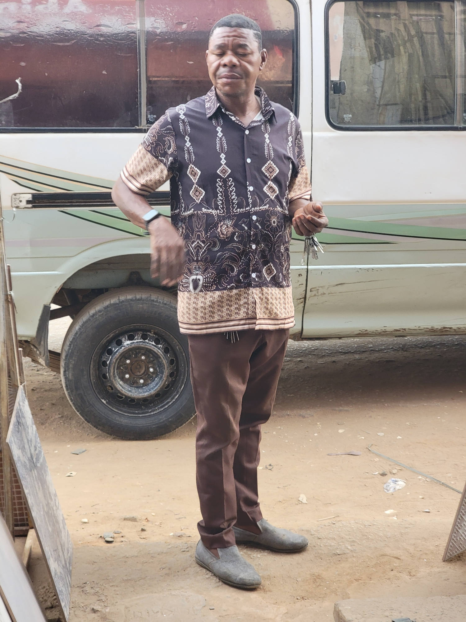 An African man stands outside, holding keys in his right hand and gesturing with his left. He wears a patterned button-down shirt and brown pants, with gray shoes. Beside him is the side of a van and…read more