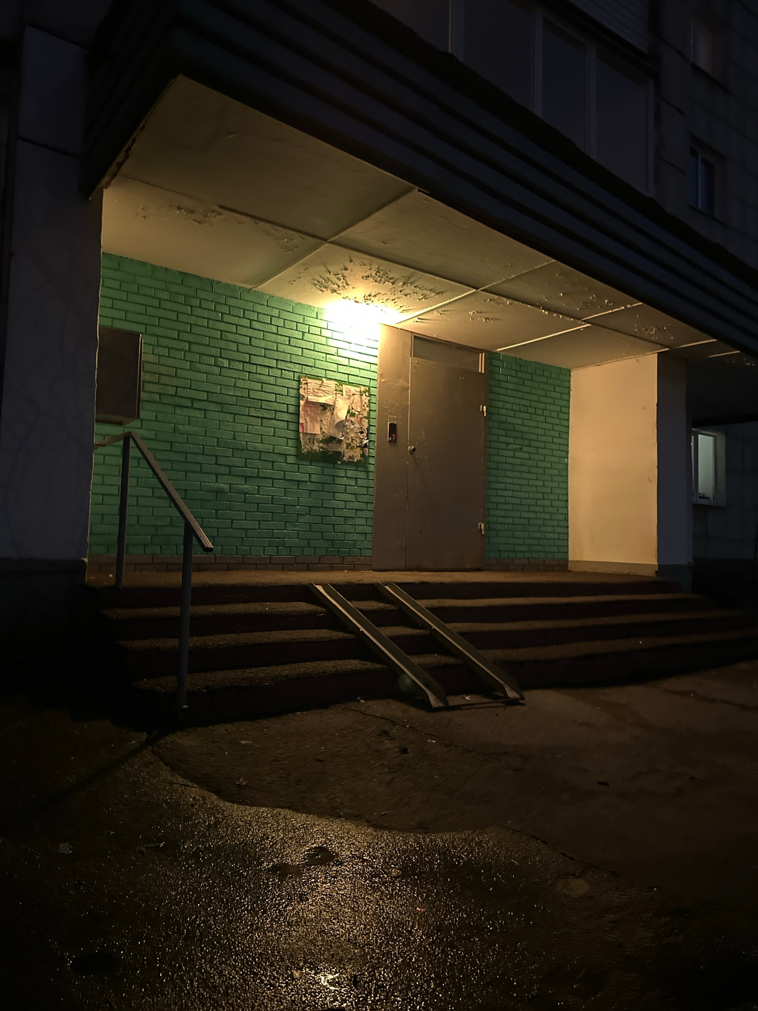 Captured from an elevated perspective, the image portrays an urban alleyway at night in Chaikovsky, Russia. The left side features the exterior of a multi-story building with a facade of light-colored…read more