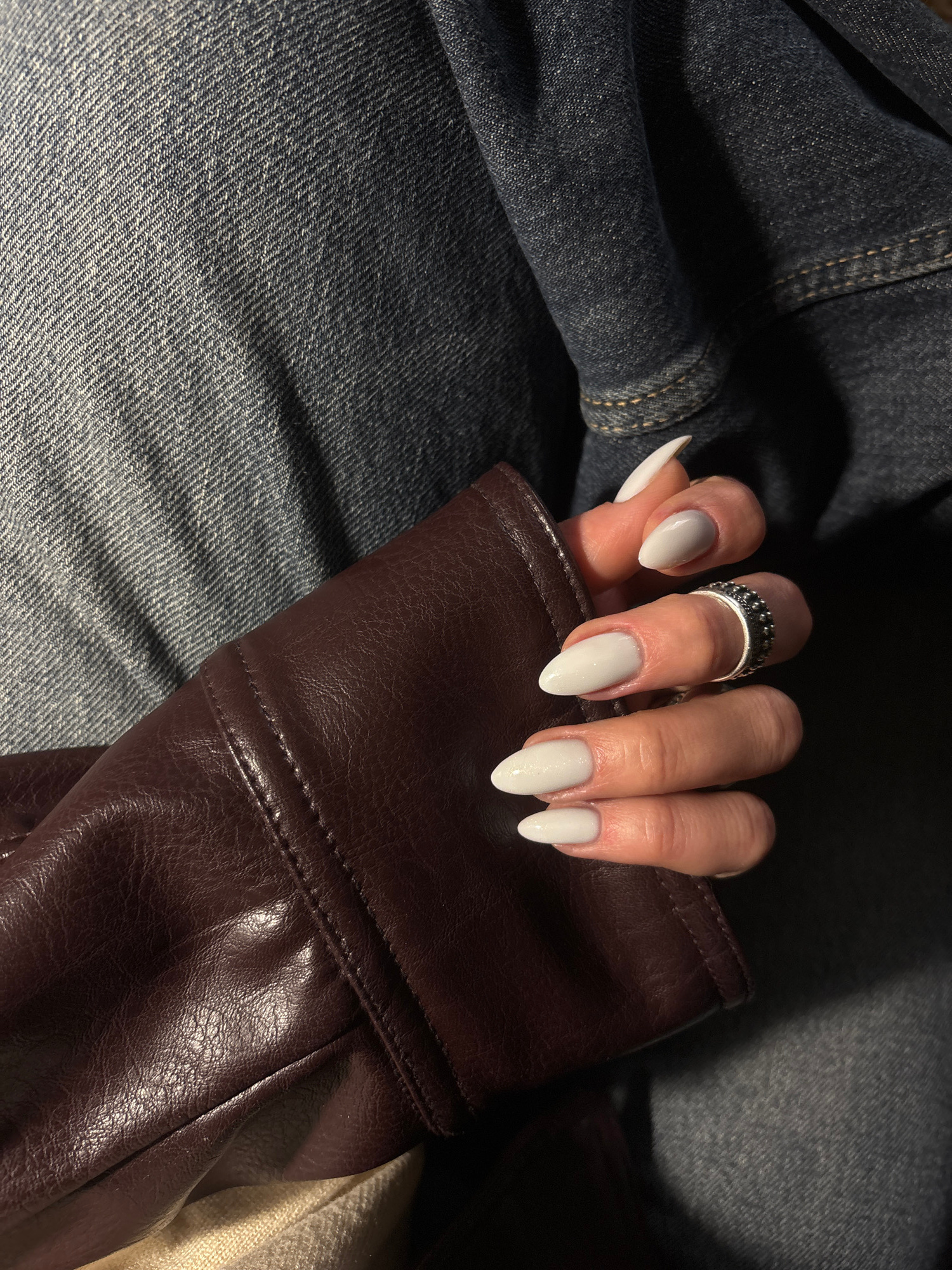 The image presents a close-up of a hand with long, almond-shaped white nails and a silver ring on the ring finger. The hand is positioned against a dark brown leather jacket sleeve and a denim fabric,…read more