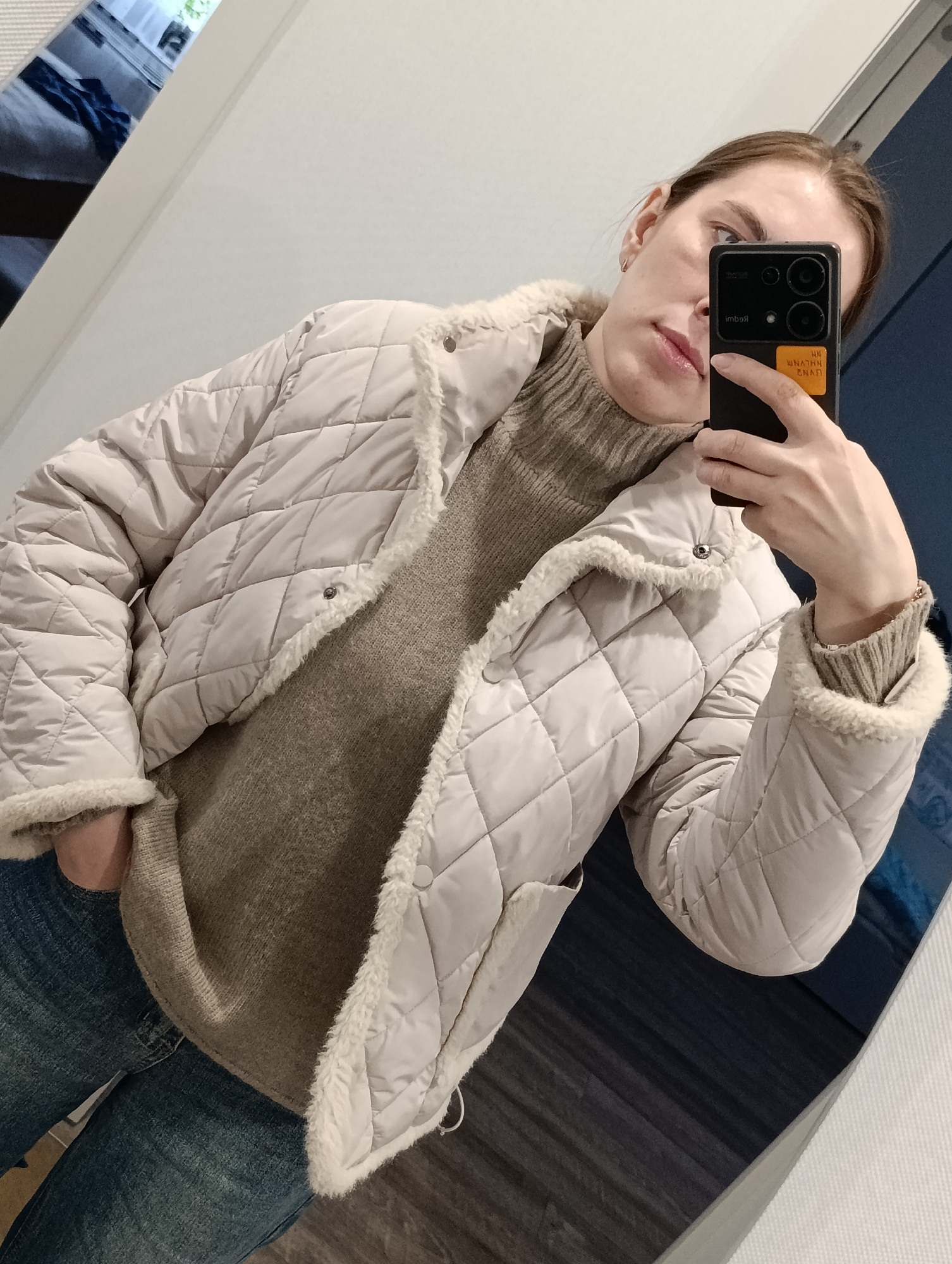 A woman is taking a selfie in what appears to be a room with a reflective surface, possibly a mirror. She is wearing a tan quilted jacket with fur trim, a tan turtleneck sweater, and blue jeans. She i…read more
