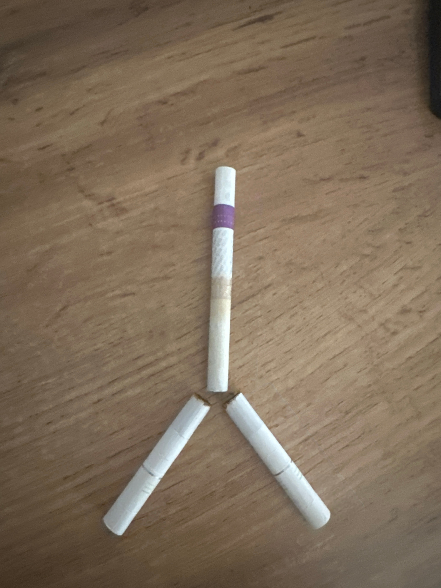 The image shows three cigarettes arranged on a wood-grained surface. One cigarette is intact with a white filter and a purple band. The other two cigarettes are broken, consisting only of the white fi…read more