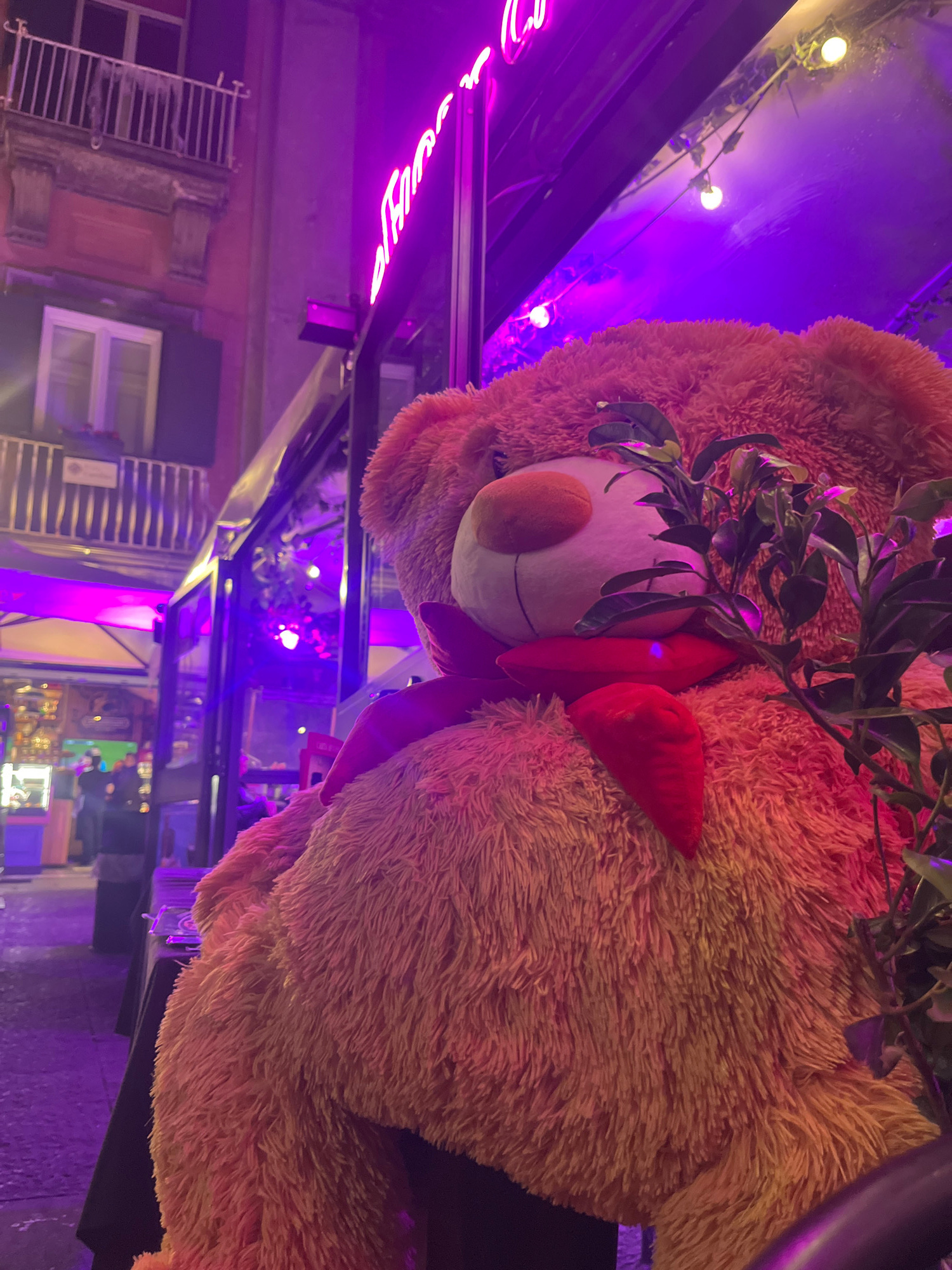 The image shows a large, light brown plush teddy bear with a white face and an orange nose. It has a red bow around its neck and is partially obscured by green leafy foliage. The scene is illuminated…read more