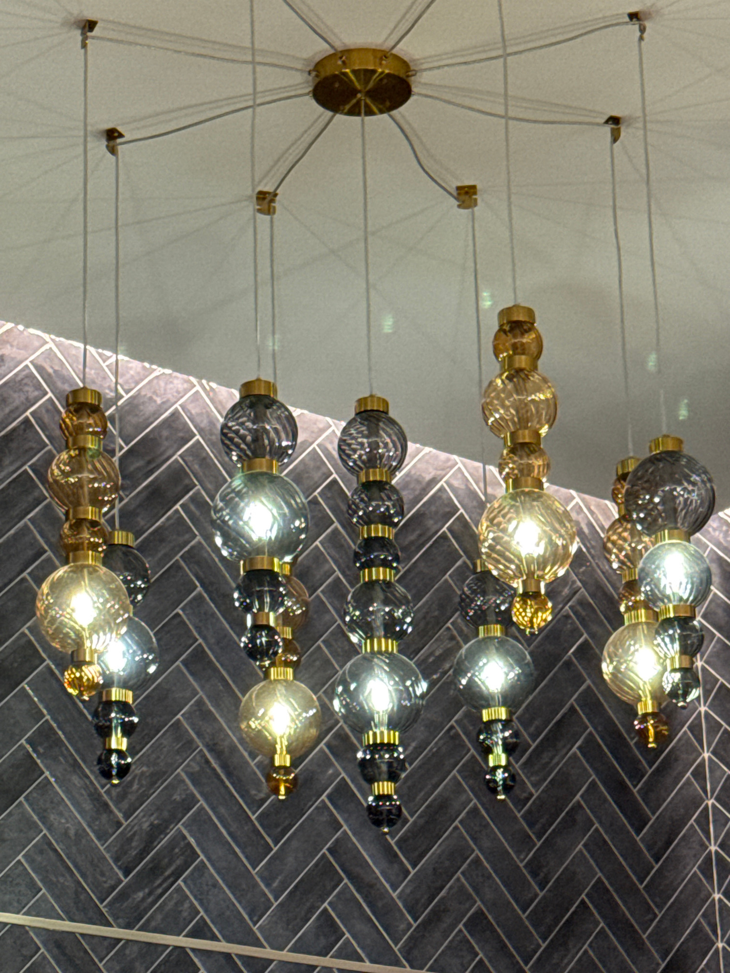 This media file captures a contemporary lighting fixture against a backdrop of contrasting architectural surfaces, set indoors in Bishkek City, Kyrgyzstan. The primary subject is a decorative chandel…read more