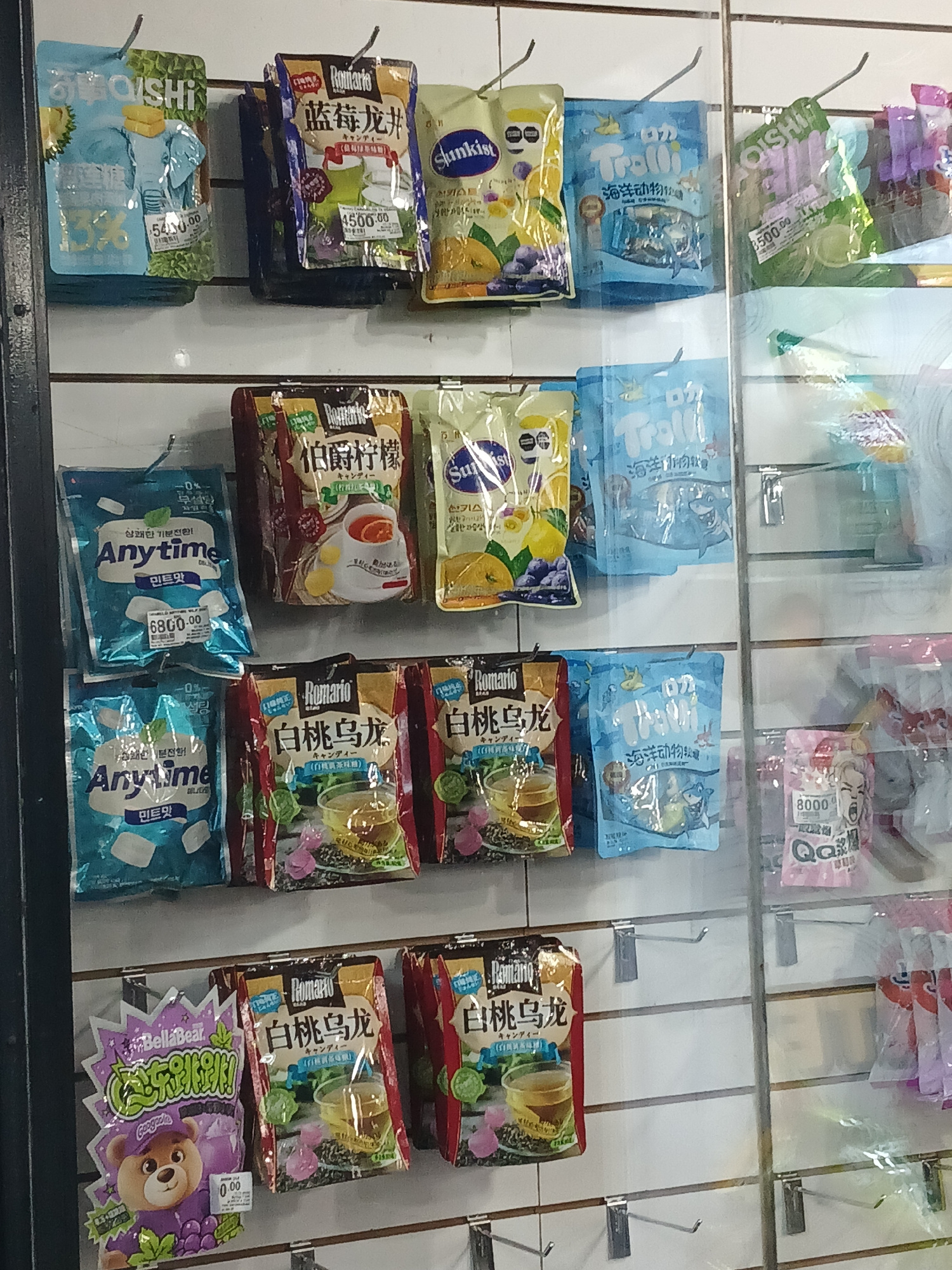 This image captures a retail display cabinet filled with various packaged candies and snacks, likely from an Asian market in Buenos Aires, Argentina. The products are neatly hung on metal hooks across…read more