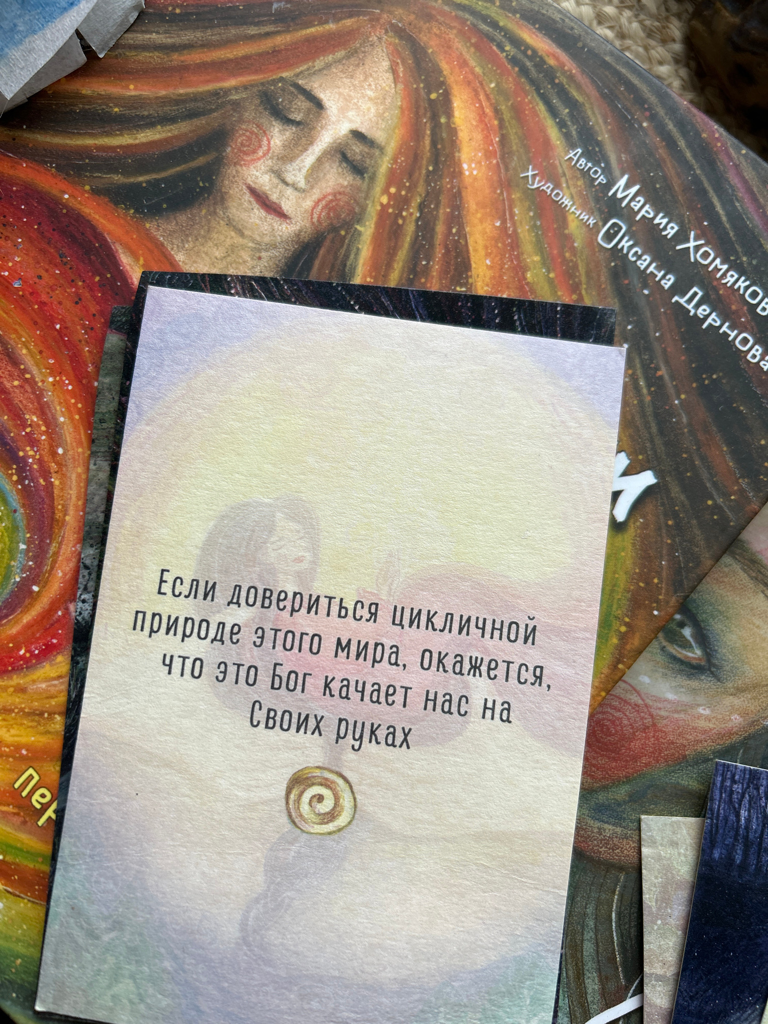 The image shows a close-up shot of several cards or book covers scattered on a surface. One card features a portrait of a woman with closed eyes and flowing hair, rendered in warm colors. Overlapping…read more