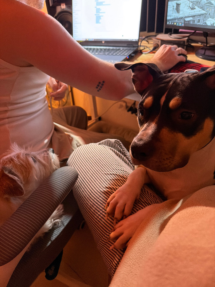 An individual lies reclined near a desk with two monitors displaying data, with a tattoo visible on their arm. A large dog with dark and light brown fur hovers close, while a smaller, fluffy dog rests…read more